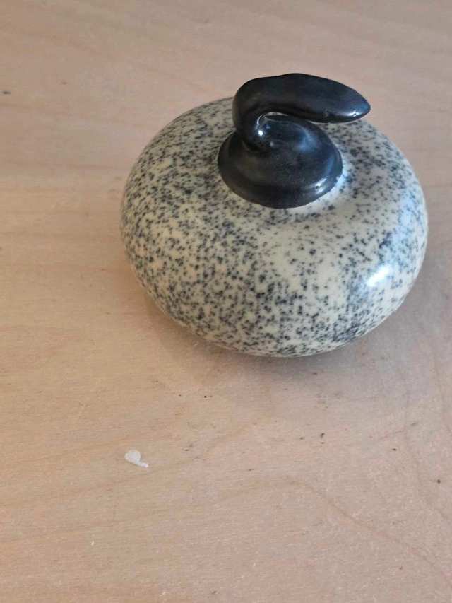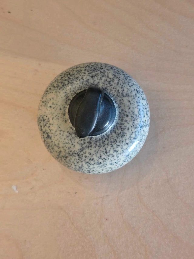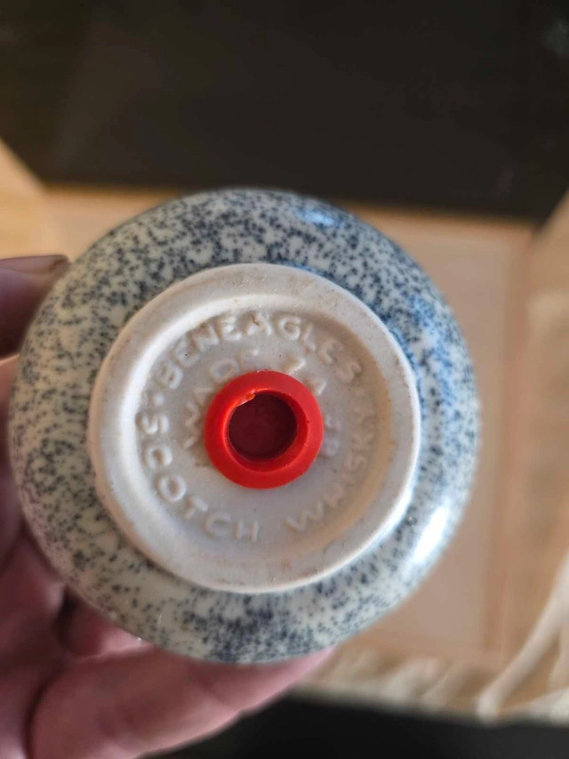 64Vintage Beneagles Scotch Whisky miniature curling stone decanter. This collectible item was produced as a promotional product for Beneagles Scotch Whisky, likely in the 1970s or 1980s. It is a small ceramic decanter designed to look like a curling stone, complete with a handle and a red stopper on the bottom. The decanters were made by Carleton Ware Pottery. The bottle is gray with dark speckles to mimic the appearance of granite.
