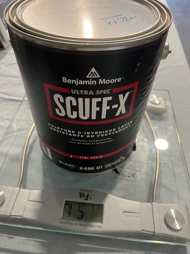 91This is a partially full can of Benjamin Moore Ultra Spec SCUFF-X interior latex paint, providing exceptional durability for high-abuse areas. The paint is in the 'Blanc' (white) colour with a matte finish, perfect for achieving a modern look while being easy to clean. This can is mostly full, as shown in the pictures. Specifications: * Brand: Benjamin Moore * Product Line: Ultra Spec SCUFF-X * Type: Interior Latex Paint * Colour: Blanc (White) * Finish: Matte * Size: One gallon