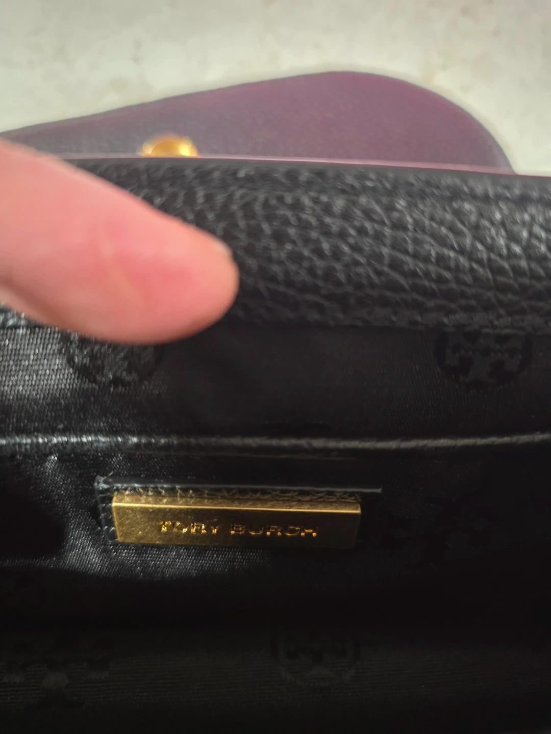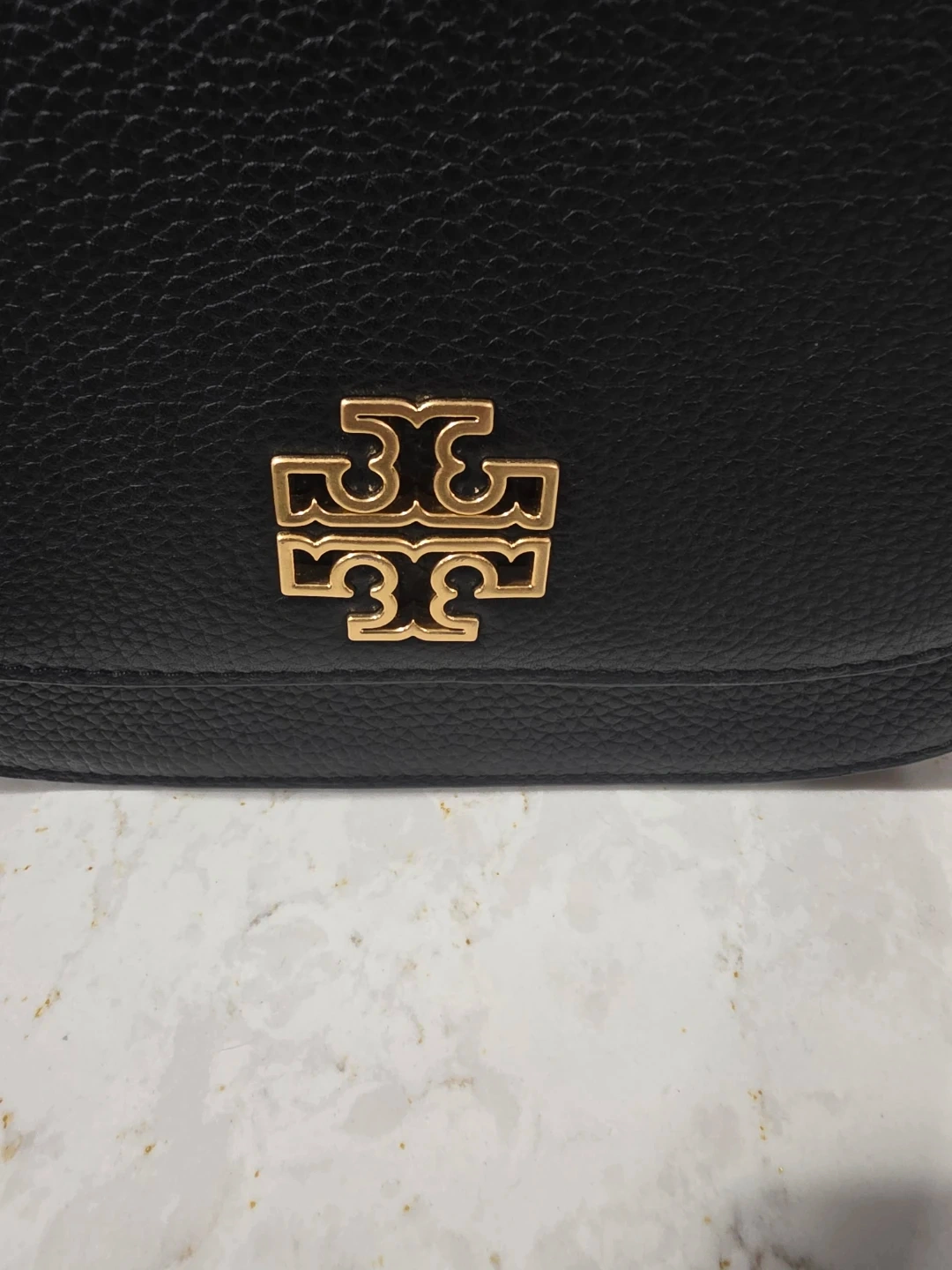 This is a Tory Burch black leather Kira sling bag (crossbody). It features a pebbled leather exterior with gold-tone hardware. The interior has card slots and a zip pocket. This bag is perfect for everyday use or a night out!