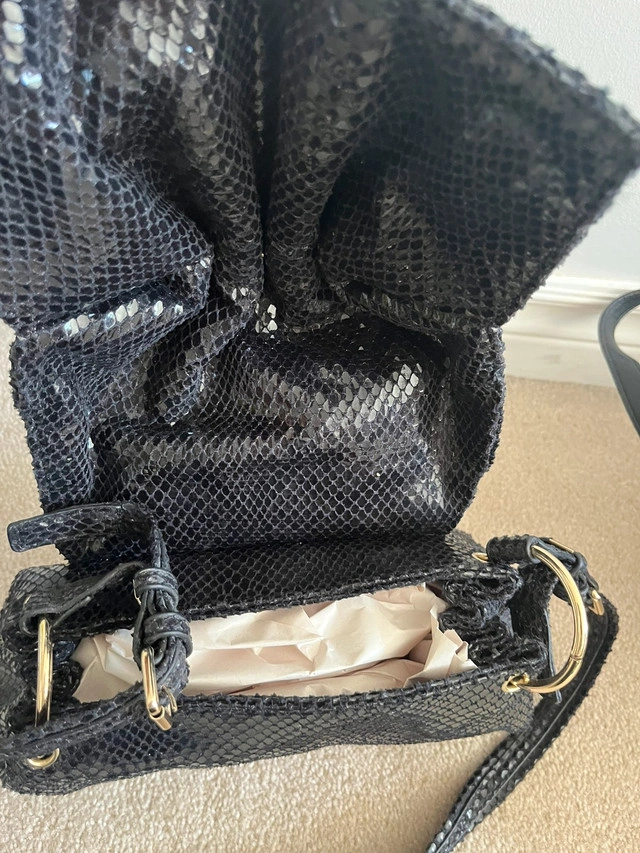 New black snake skin shiny crossbody evening purse Never been worn INZI bag Magnetic closure with zipper pocket inside.
