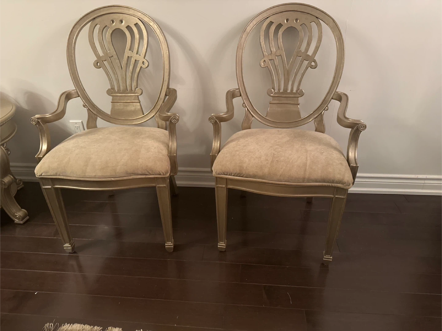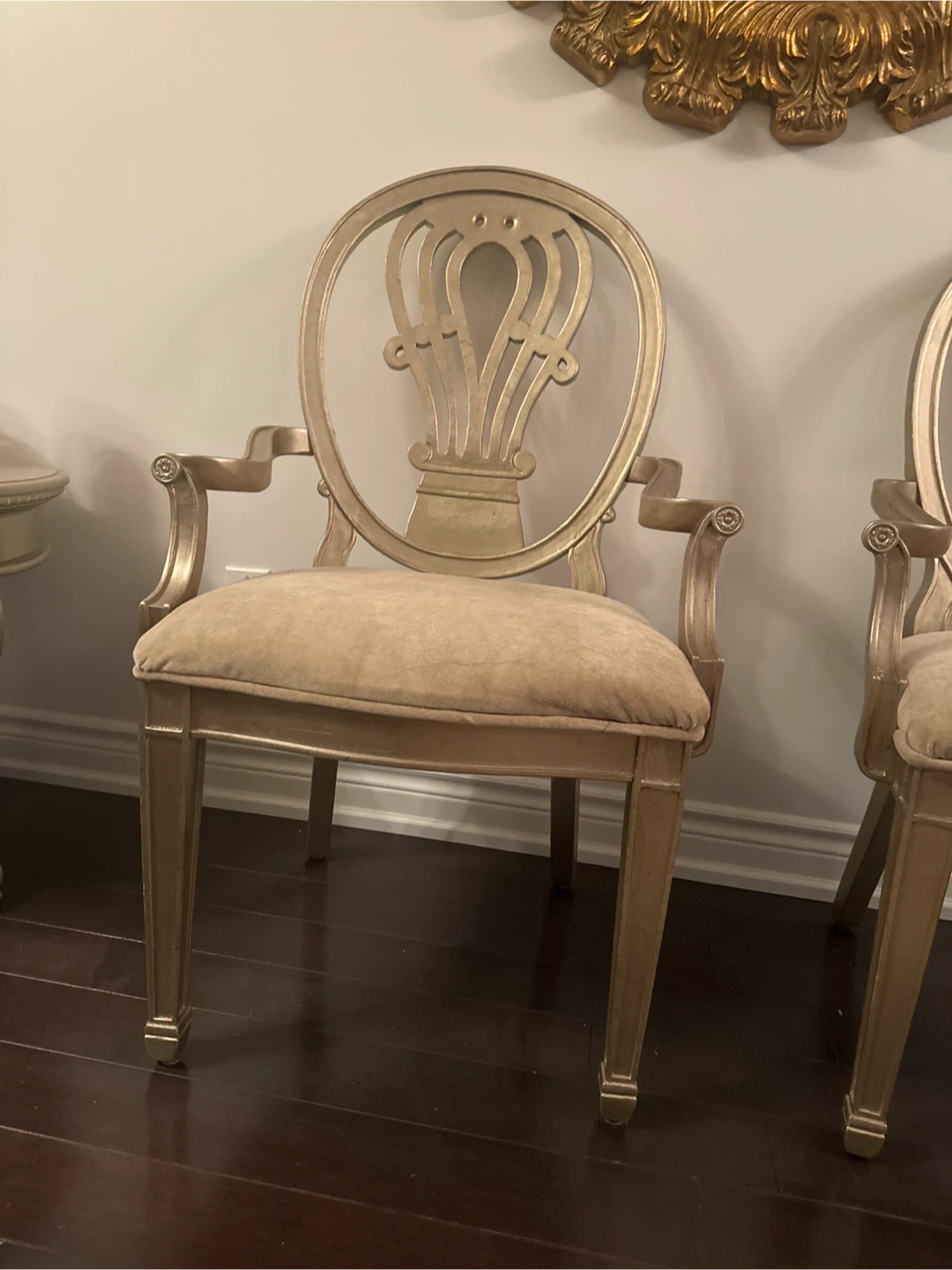 I have 4 peace of Elegant accent chair each $80 with a distinctive open back design and upholstered seat. Features a metallic gold finish and ornate detailing on the frame. The seat is covered in a neutral-toned fabric.