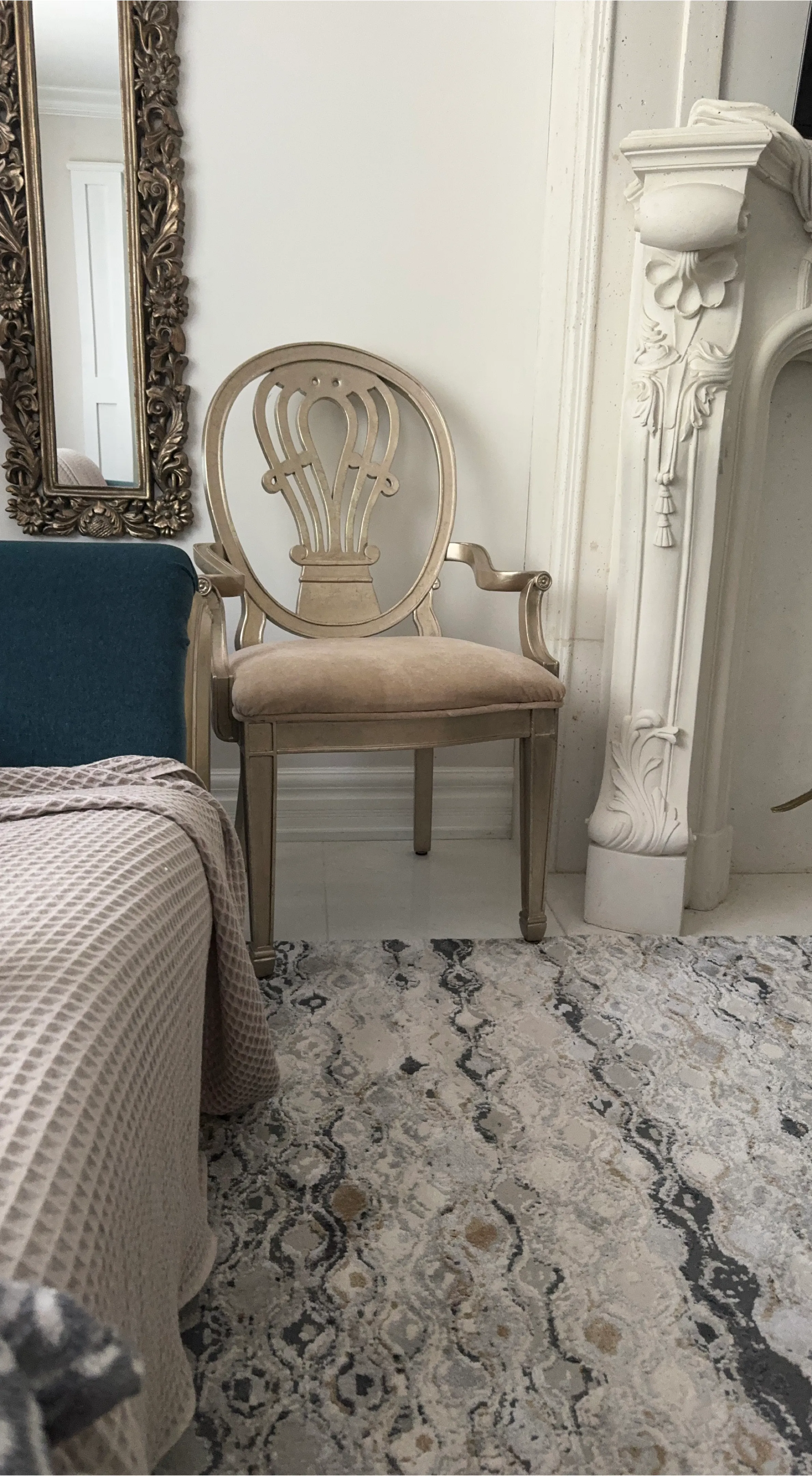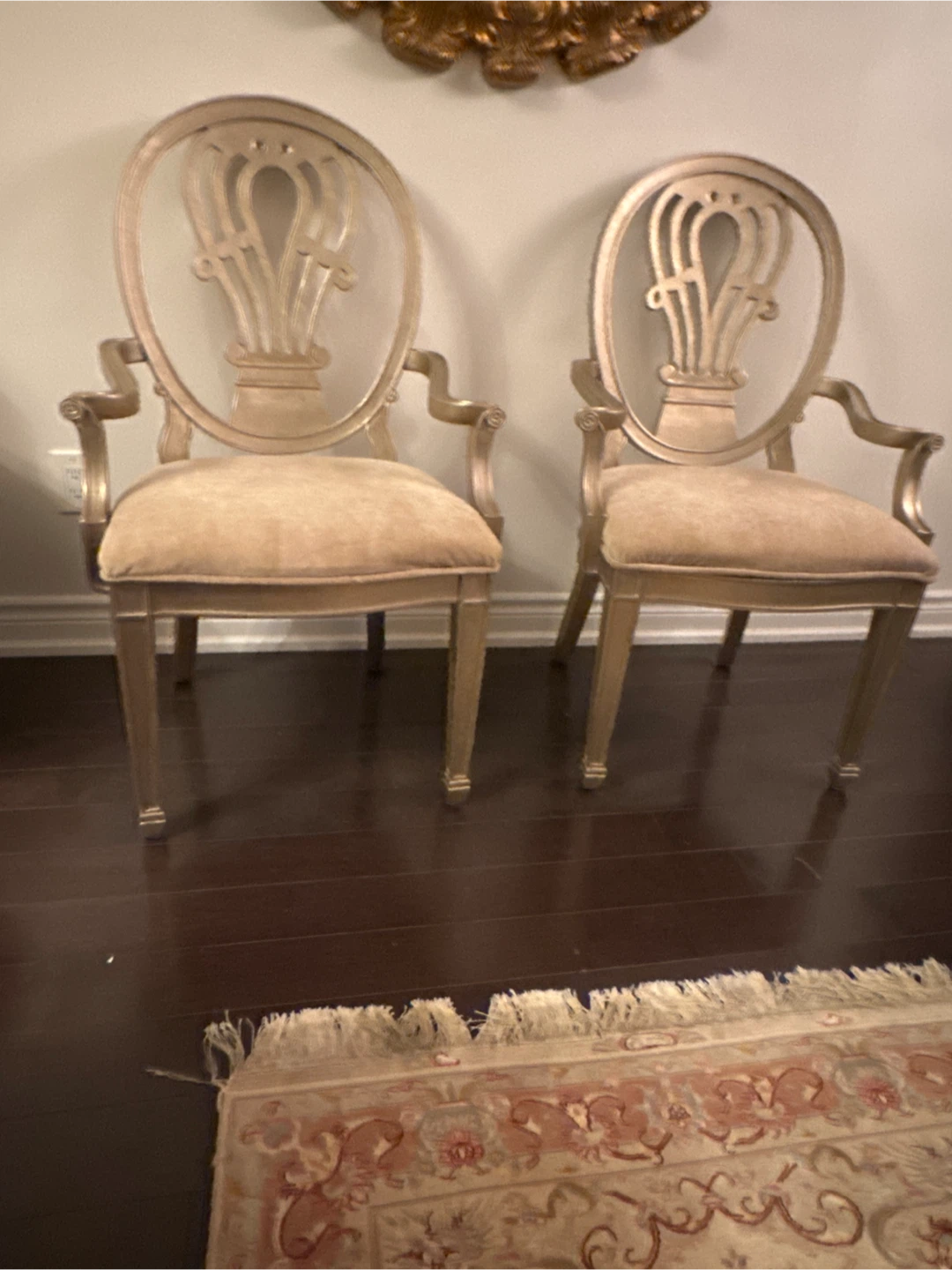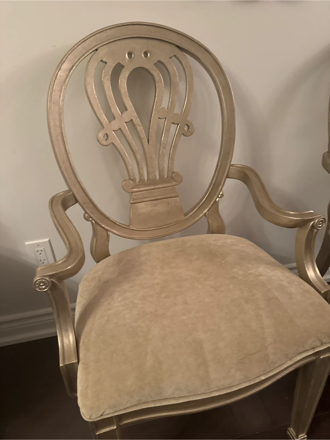 I have 4 peace of Elegant accent chair each $80 with a distinctive open back design and upholstered seat. Features a metallic gold finish and ornate detailing on the frame. The seat is covered in a neutral-toned fabric.