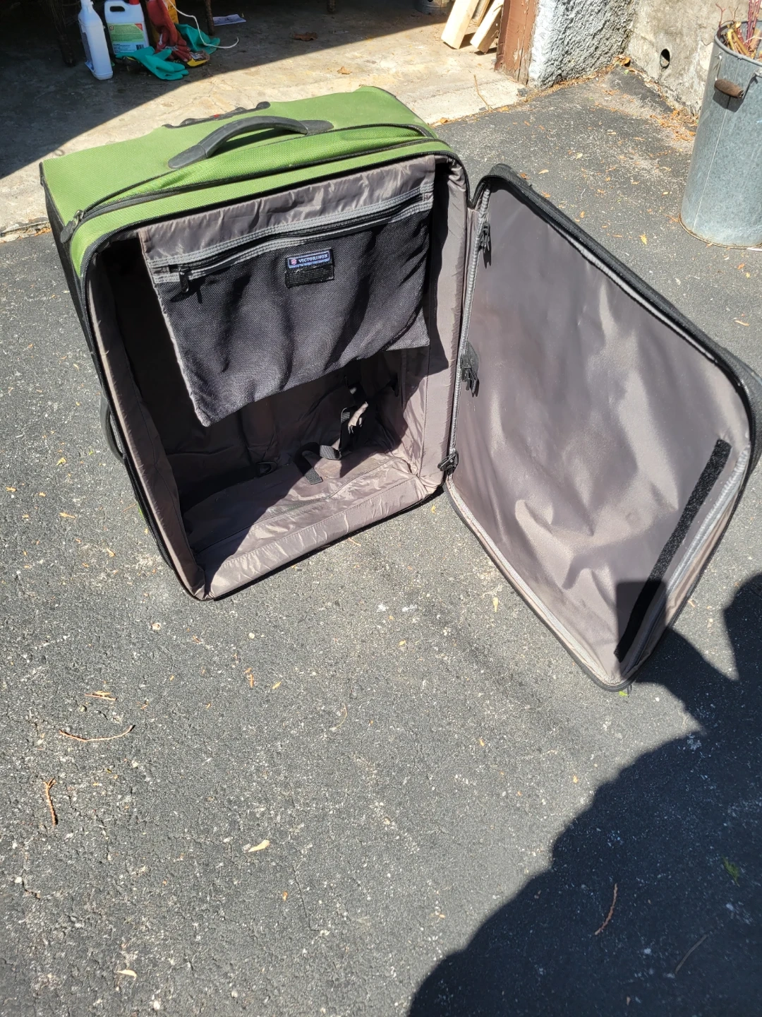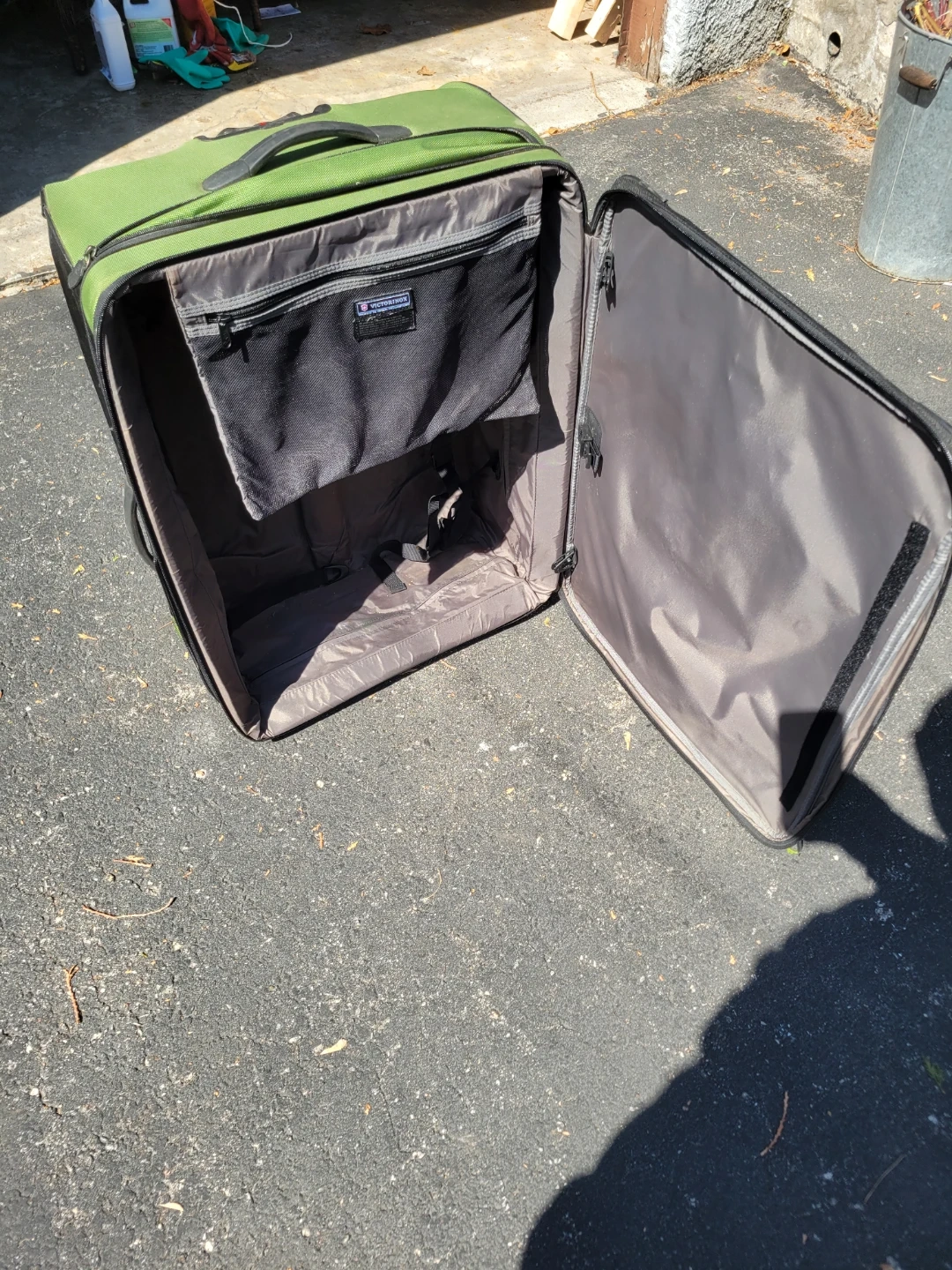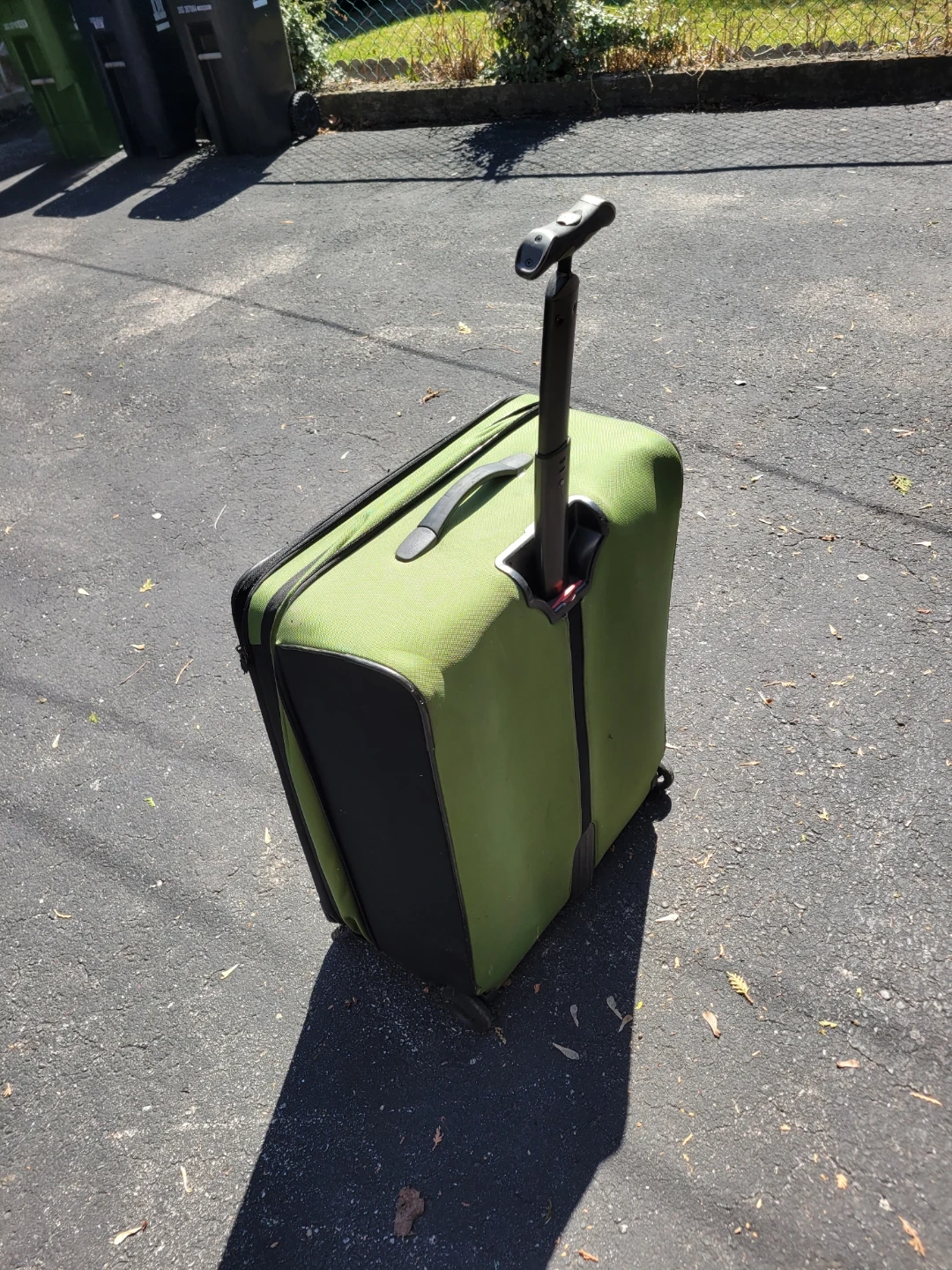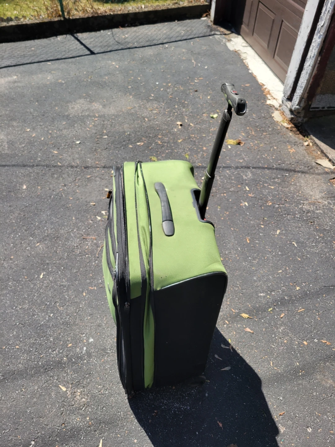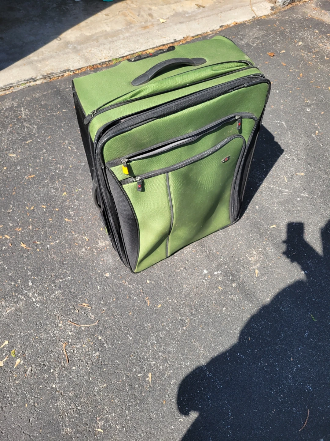 This is a large green rolling suitcase, perfect for longer trips. It's made of durable fabric and features an extendable handle and wheels for easy transport. The interior has multiple compartments for organization.