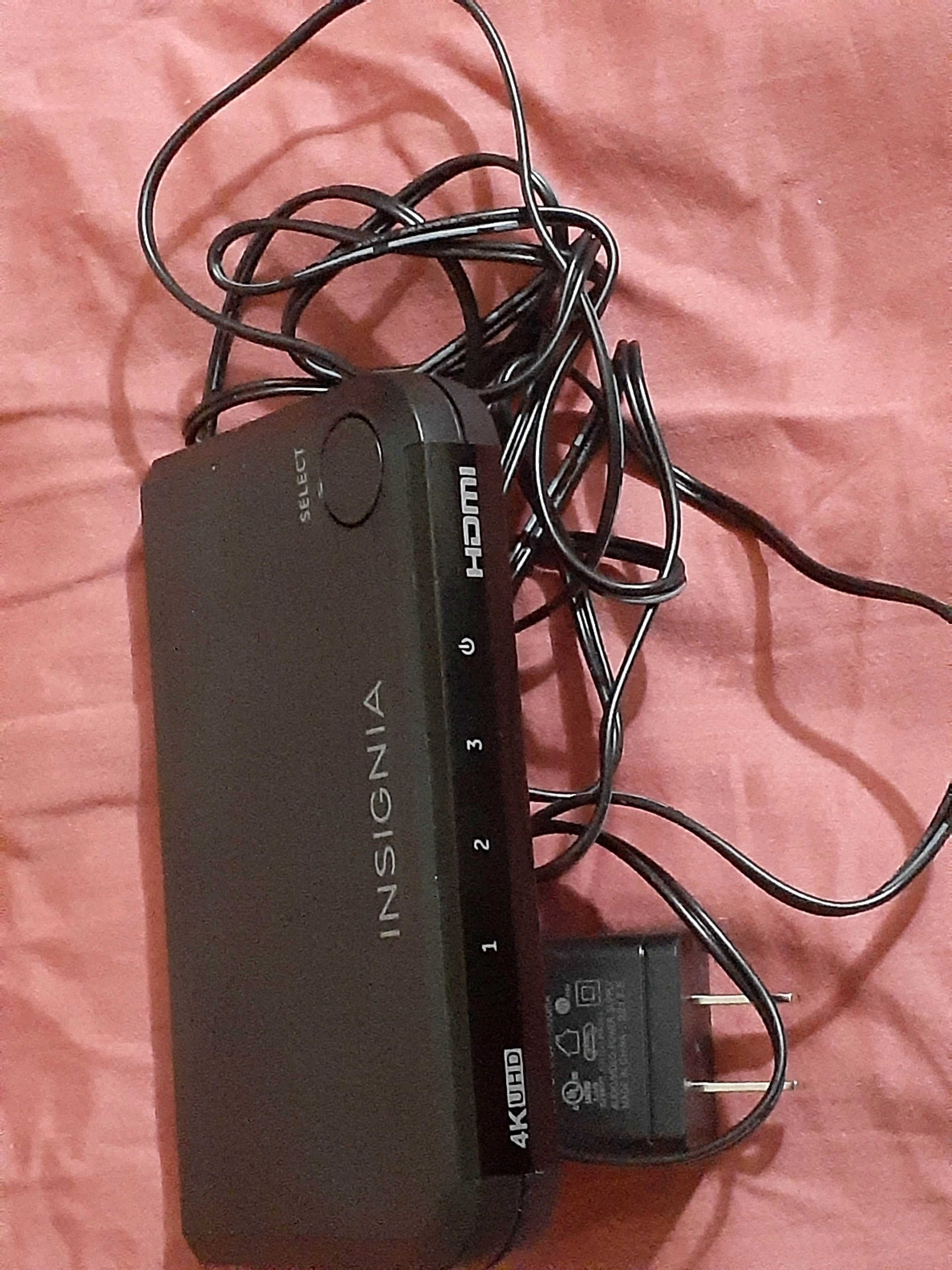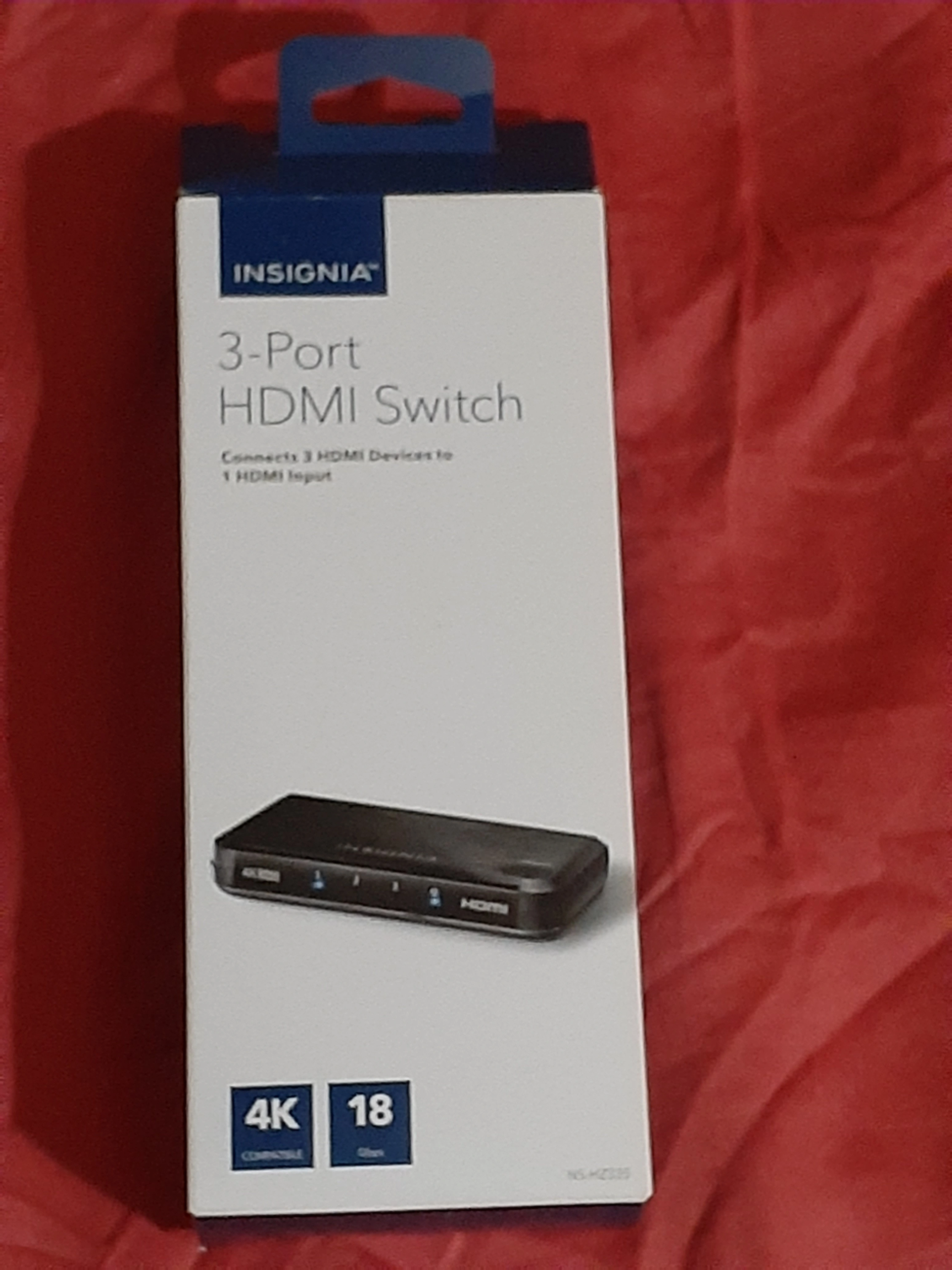 This is 4K compatible HDMI switcher that enables various electronics, and display high visual resolutions. It's accentuated with three "input" outlets and one "output" outlet, as well as small usb adapter and a user guide. Also, the device allows you TO SWITCH DISPLAYS between devices at the press of a button. There's no damage, and it's small to fit on a desk.