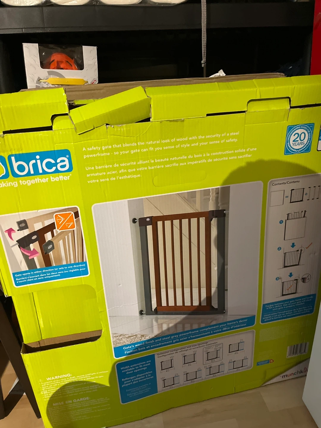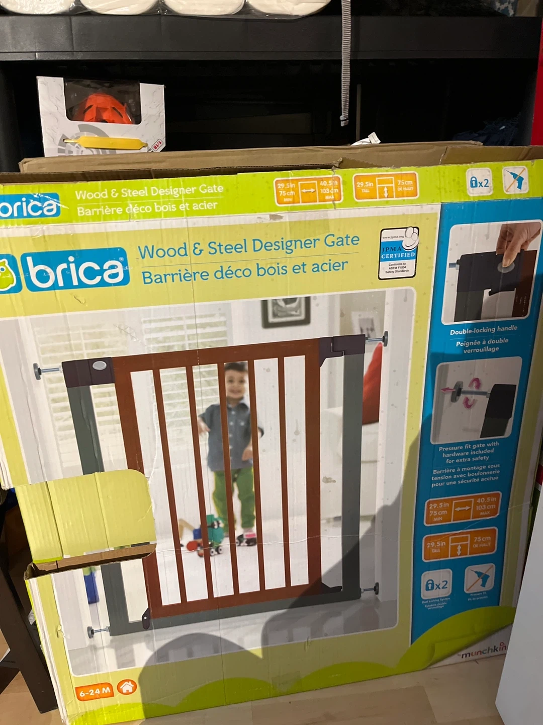 Selling a brand new brica Wood & Steel Designer Gate, still in its original box! This safety gate blends the natural look of wood with the security of a steel powerframe. It fits openings from 29.5 to 40.5 inches (75 cm to 103 cm). Recommended for ages 6-24 months. Keep your little one safe and sound!