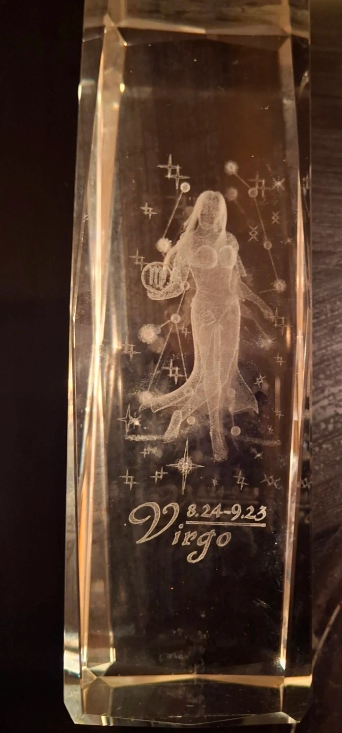 This crystal figurine features an etched design of the Virgo zodiac sign with constellations. It also displays the dates August 24th to September 23rd. Adds a touch of celestial elegance to any space.