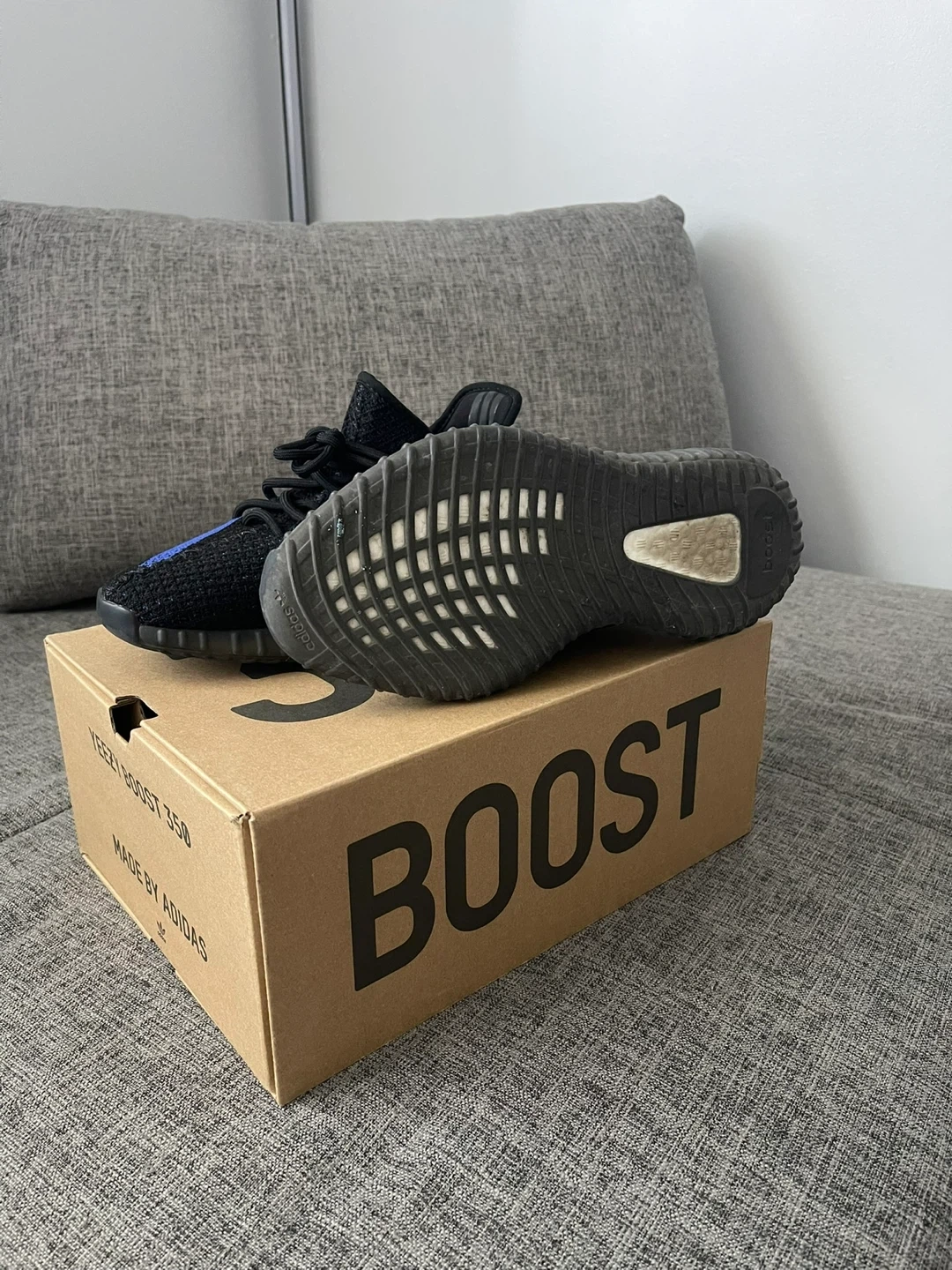 Black knit upper with blue stripe detail. These sneakers are size 8 and come with their original box. It's a classic design with Boost cushioning for comfort. You'd wear these for everyday style.