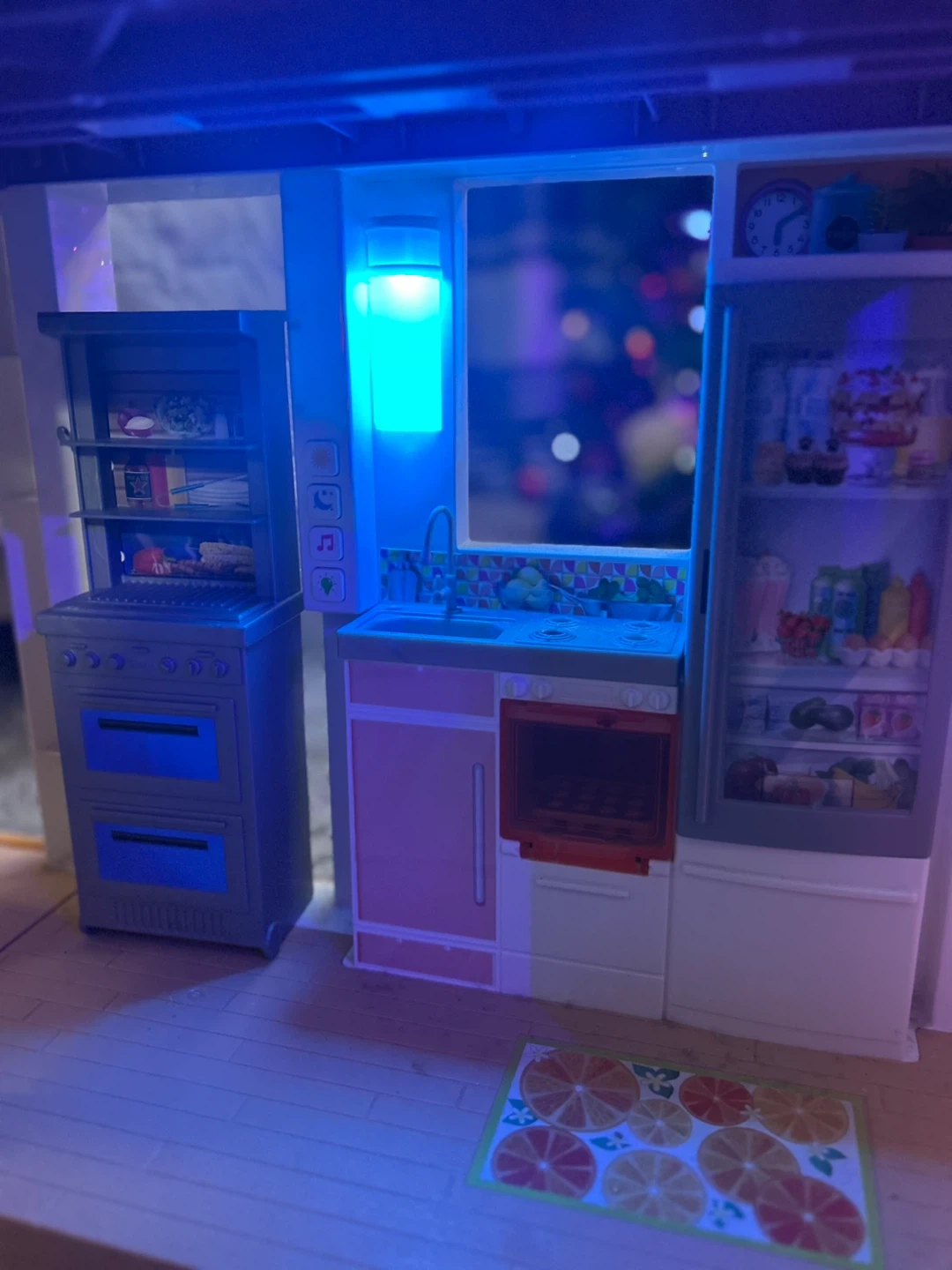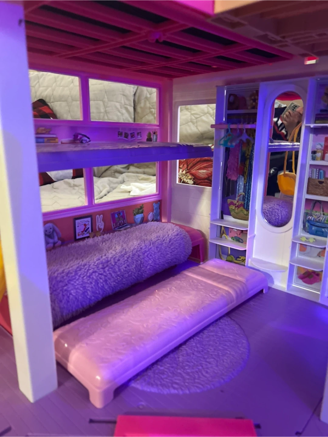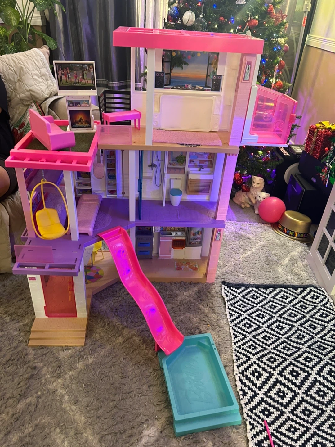 This is a large Barbie Dreamhouse dollhouse with multiple levels and rooms. It includes furniture like a bed, couch, toilet, sink, shower, refrigerator, and oven. The dollhouse also features a slide and a pool attachment, offering lots of play possibilities! It's perfect for imaginative play sessions.