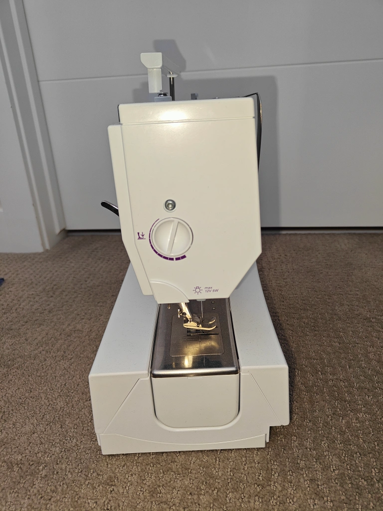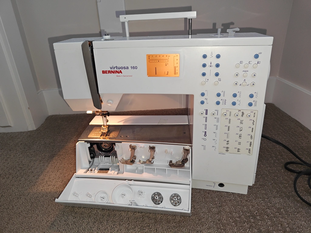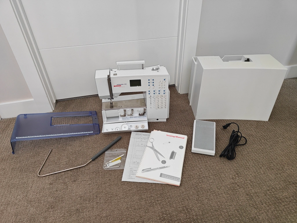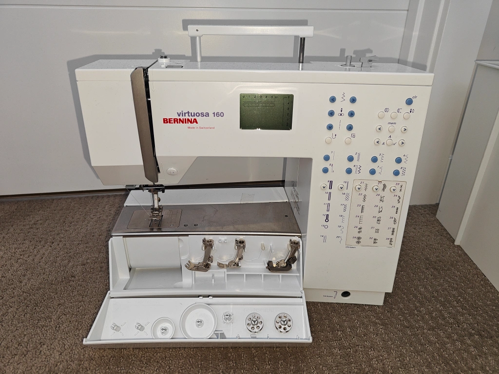 NOTE 1: Feed Dogs are worn down but were raised up so that the fabric feeds through properly NOTE 2: A part of the wire on the foot pedal was damaged by an animal. However, the wires were twisted back together and is currently in working condition (please see attached photos) NOTE 3: Most of the original pieces to the sewing machine are included (Note: the seam ripper is included but has a crack on the handle). The only missing pieces are: original needles (1 used included), seam guide, and separate spool holder pin. I am selling a Bernina Virtuosa 160 in used, tested, and working condition. A fantastic machine known for its precision and ease of use. Perfect for both beginners and experienced sewers. Last serviced January 2025. Includes: * Bernina Virtuosa 160 Sewing Machine * Carrying Case (Hard Cover) * Foot Pedal * 4 Presser Feet (Reverse Pattern Foot, Buttonhole Foot, Zipper Foot, Blind Stitch Foot) * Sewing Table Attachment * Presser Foot Lifter * Power Cord * 2 Bobbins * Small Screwdriver * Offset Screwdriver (Torx) * Brush * Height Compensating Plate * Spool Discs, 3 * Instruction Manual Features: * Variety of stitch patterns, including utility, decorative, and quilting stitches. * Adjustable stitch length and width. * Needle up/down function. * Easy threading system. * Free-hand system (knee lever) for comfortable fabric manipulation. * Bright LED lighting. * Sturdy and reliable Bernina quality * Automatic buttonholes Comes from a pet and smoke-free environment. Pickup in Mount Pleasant (NW Calgary)