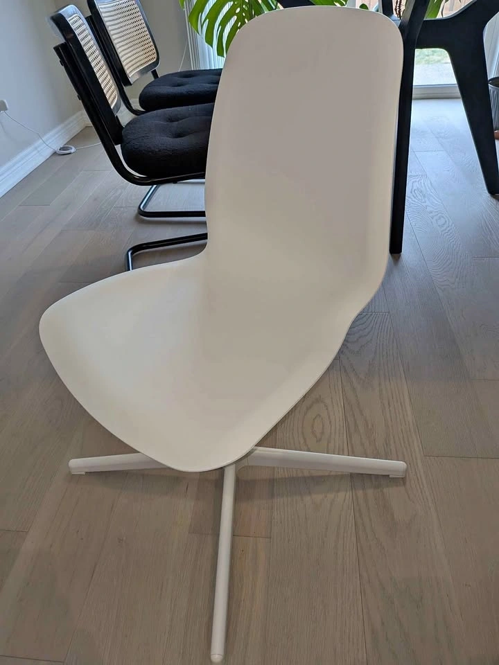 This chair features a comfortable, contoured seat with a swivel base—perfect for a home office or dining setup. It has a sleek, modern look without armrests, allowing it to tuck fully under most desks. Great condition, well-maintained. Height adjustable, swivel base, built-in lumbar support.