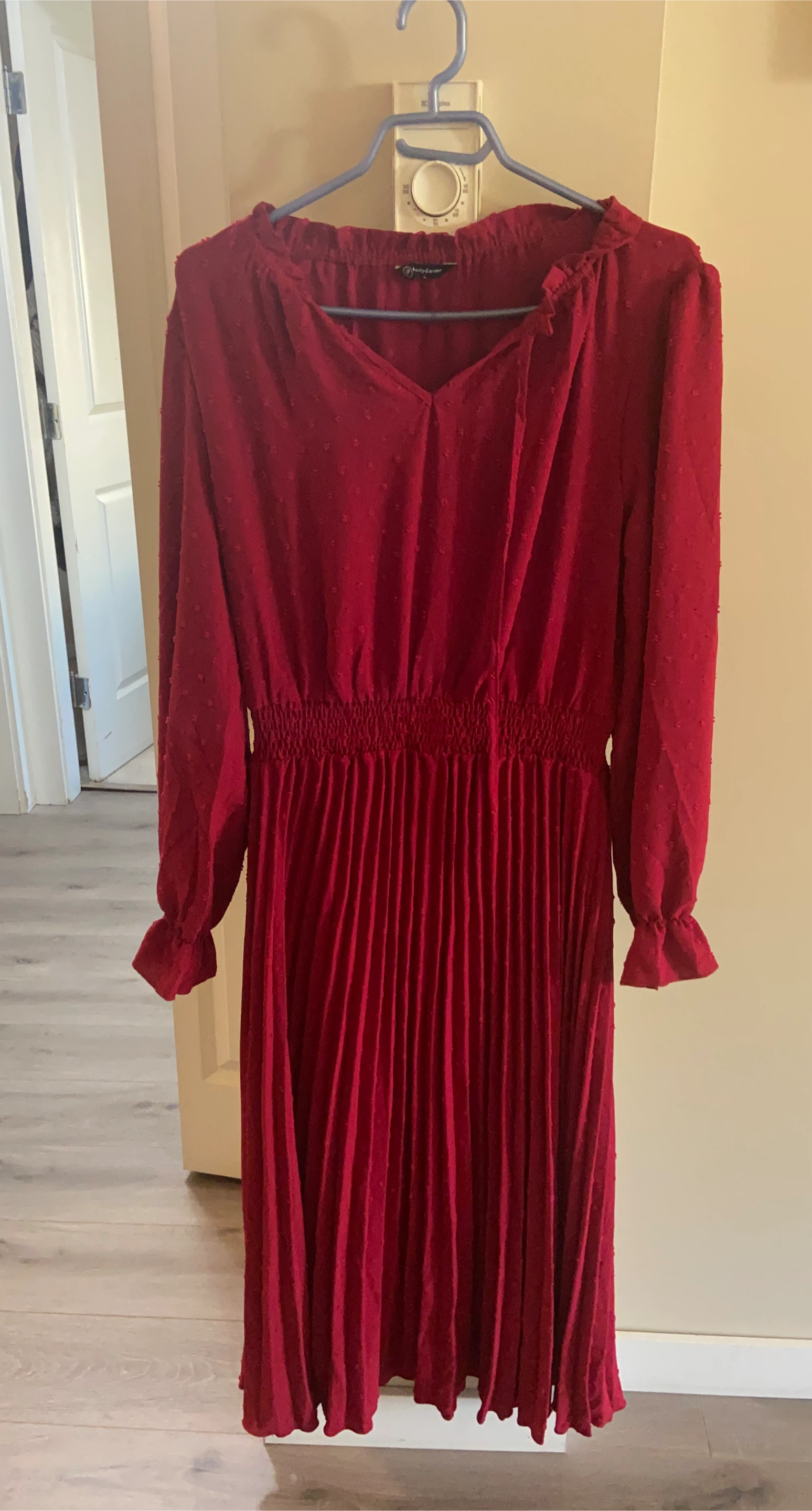 10A lovely burgundy dress from Berry Garden! It features long sleeves, a V-neck, and a pleated skirt. Perfect for a special occasion or a night out