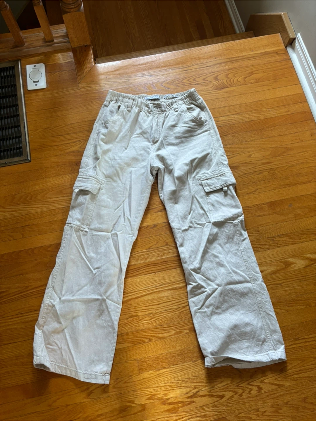 Selling a pair of Bershka cargo straight pants in a beige colour. Bought in Budapest! They are a size L and are in great condition. Perfect for a casual, comfy look!