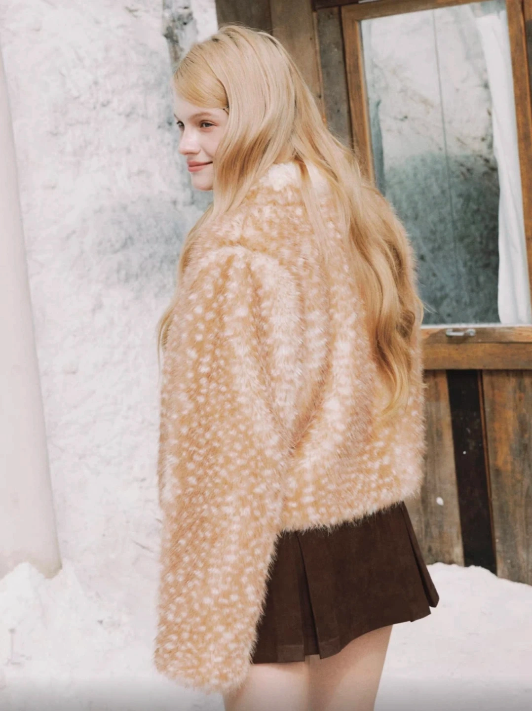 Like New. Super soft and fluffy faux fur cropped jacket with a relaxed fit. Fawn color pairs well with casual and dressy looks. Very easy to layer and style. Hook style closure. Oversized, can fit S-L. PTP-20"