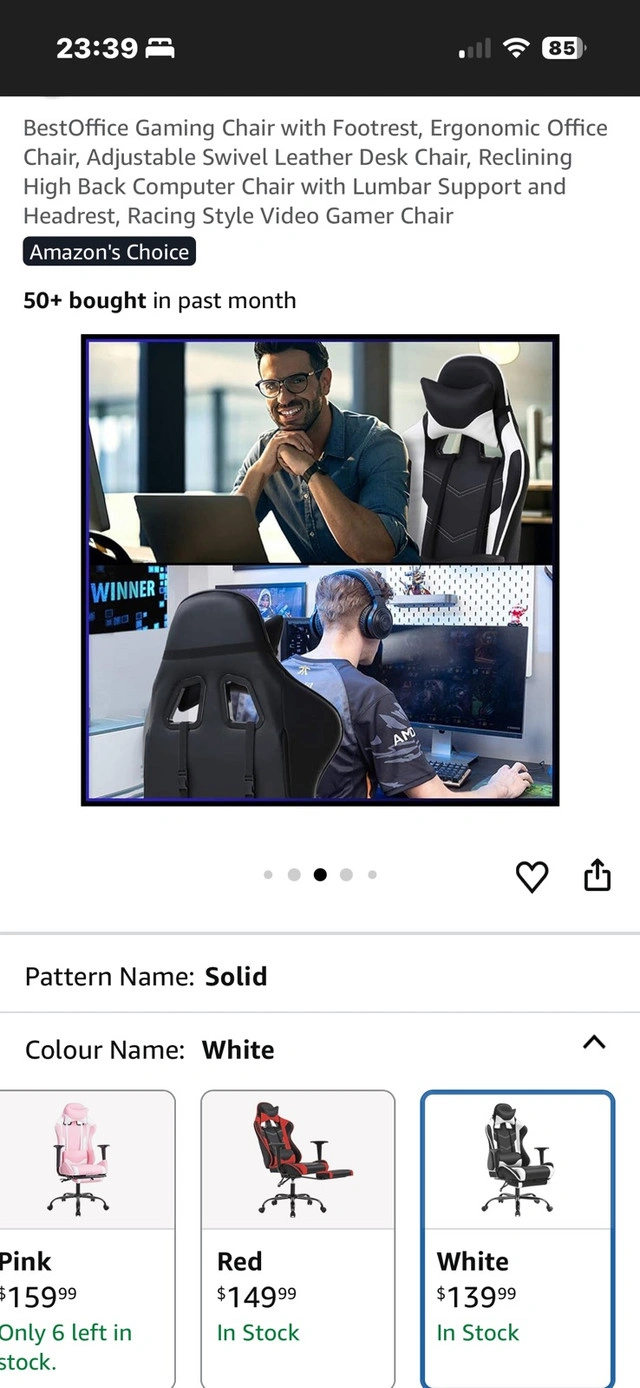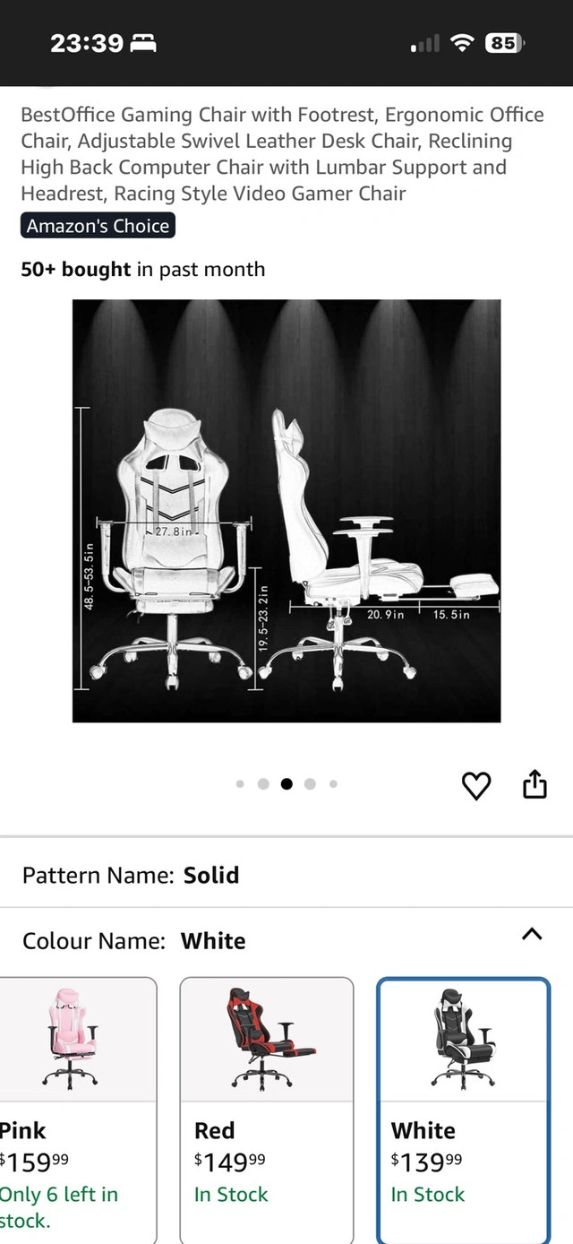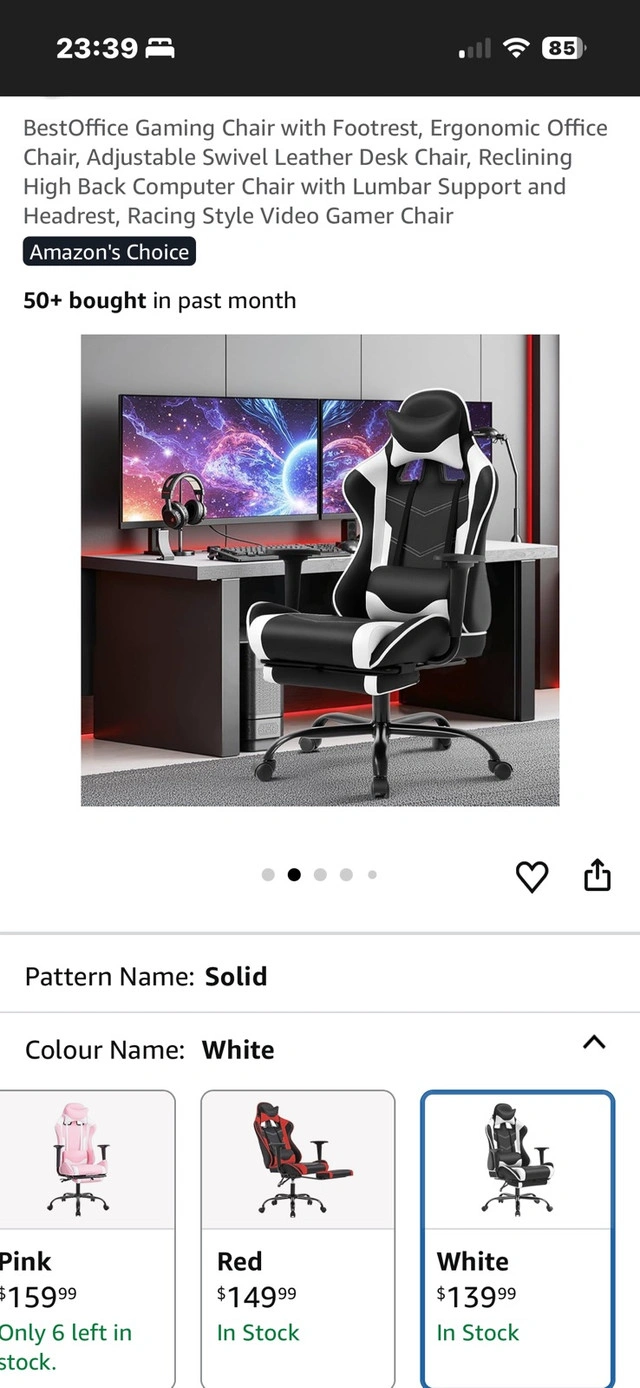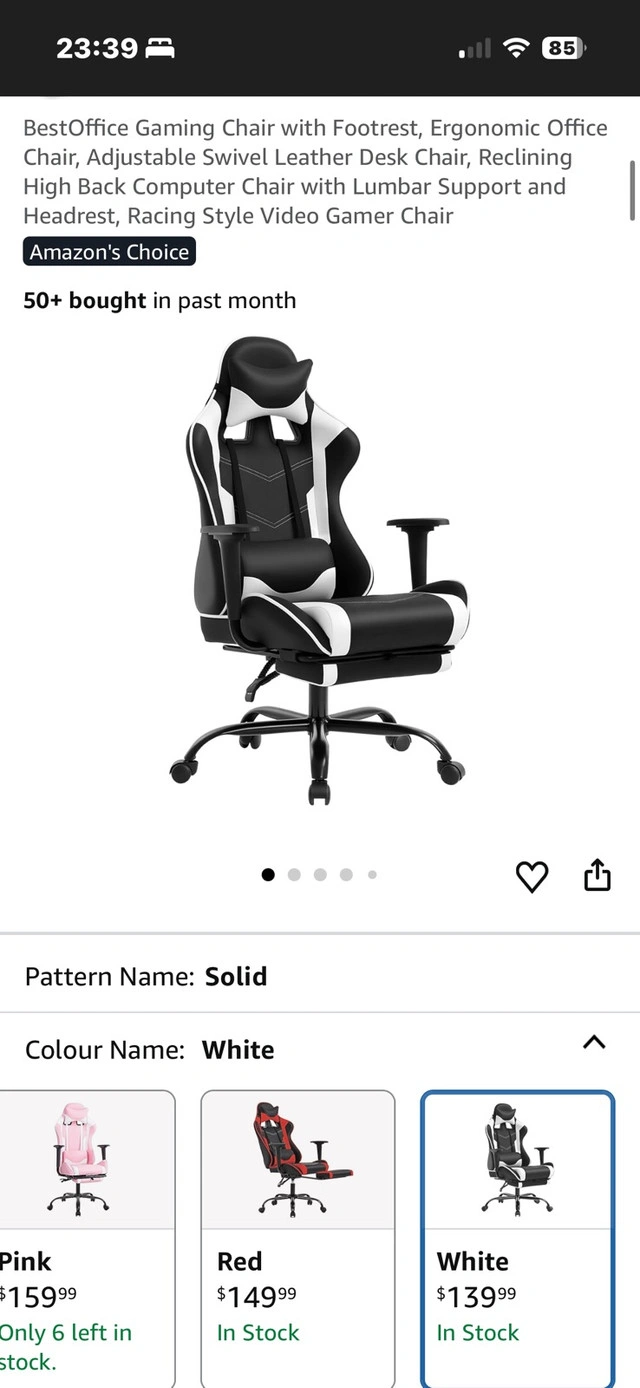 10Elevate your gaming experience with this BestOffice gaming chair, featuring an ergonomic design and adjustable swivel. This chair has been used but remains in good condition, ready to provide comfort during those long gaming sessions or workdays. With its sleek design and supportive features, it's an excellent addition to any setup. Here are some of its features: * Ergonomic design * Adjustable swivel * Lumbar support * Headrest Ready to roll into your gaming den or home office, this chair is waiting for its next adventure. If the ad is still up, it's still available!
