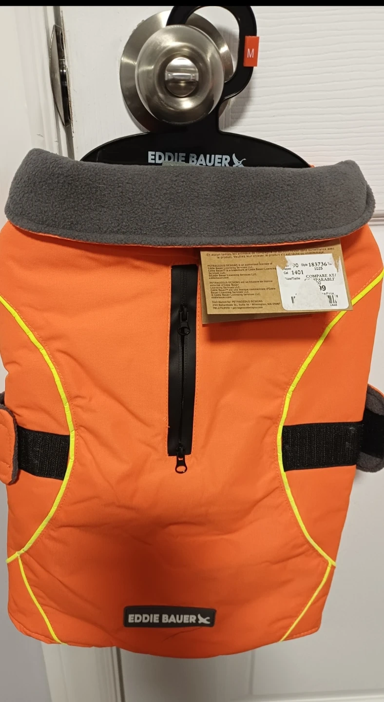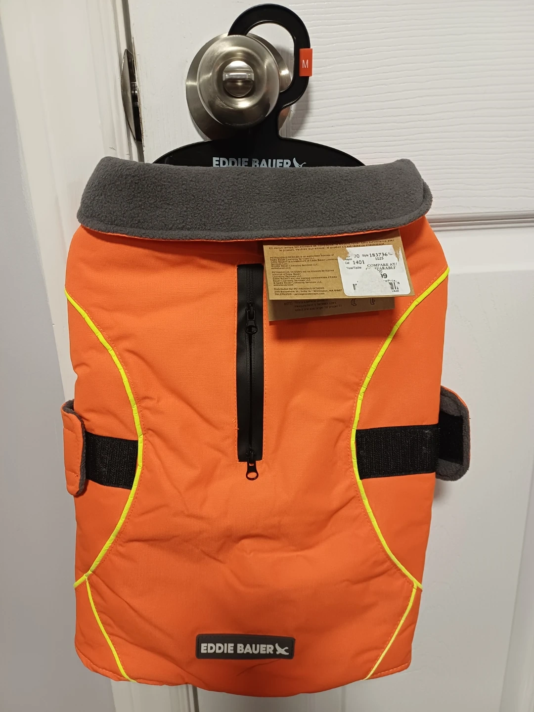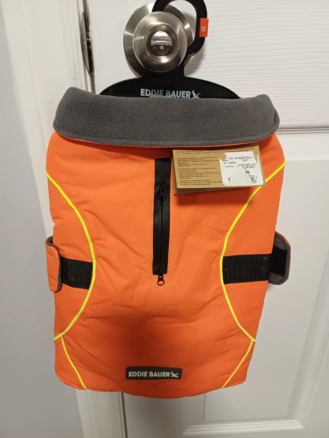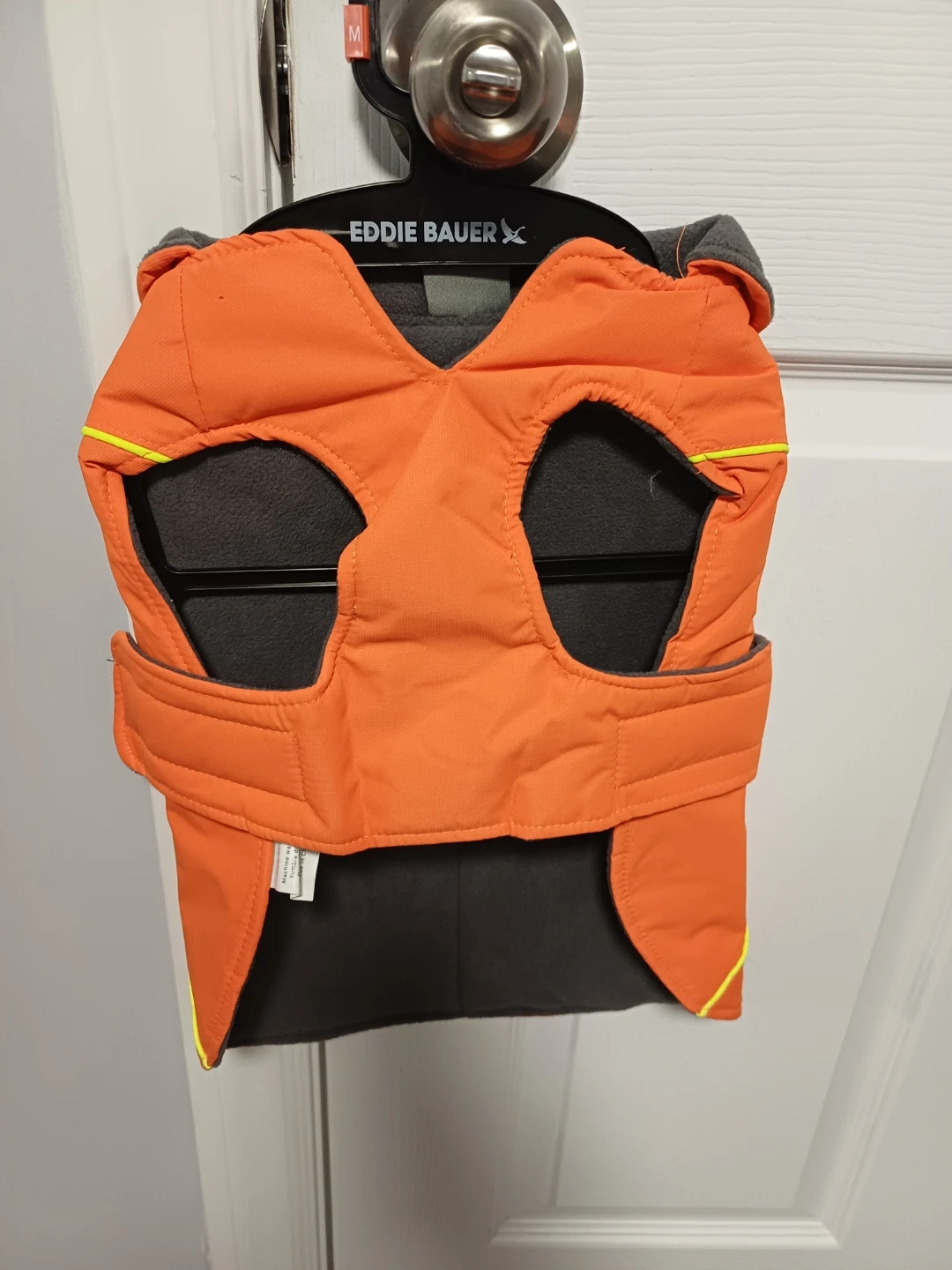 Eddie Bauer Spokane dog vest in a bright orange colour. It's a size medium with reflective trim. Fleece-lined collar for extra warmth. It has adjustable hook-and-loop straps for a secure fit. This vest is great for keeping your dog visible and warm on outdoor adventures!