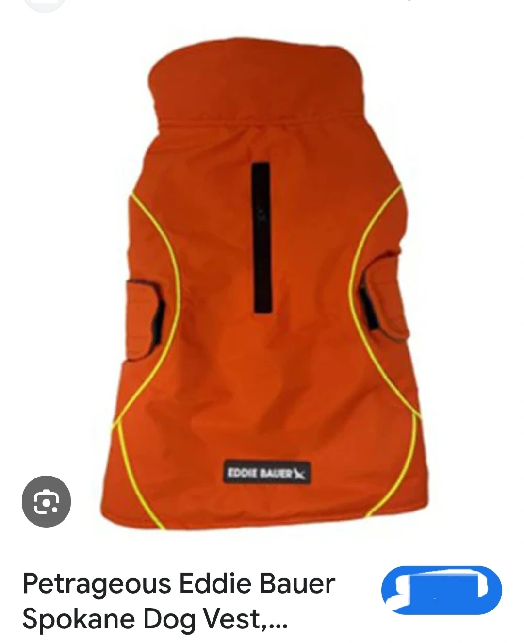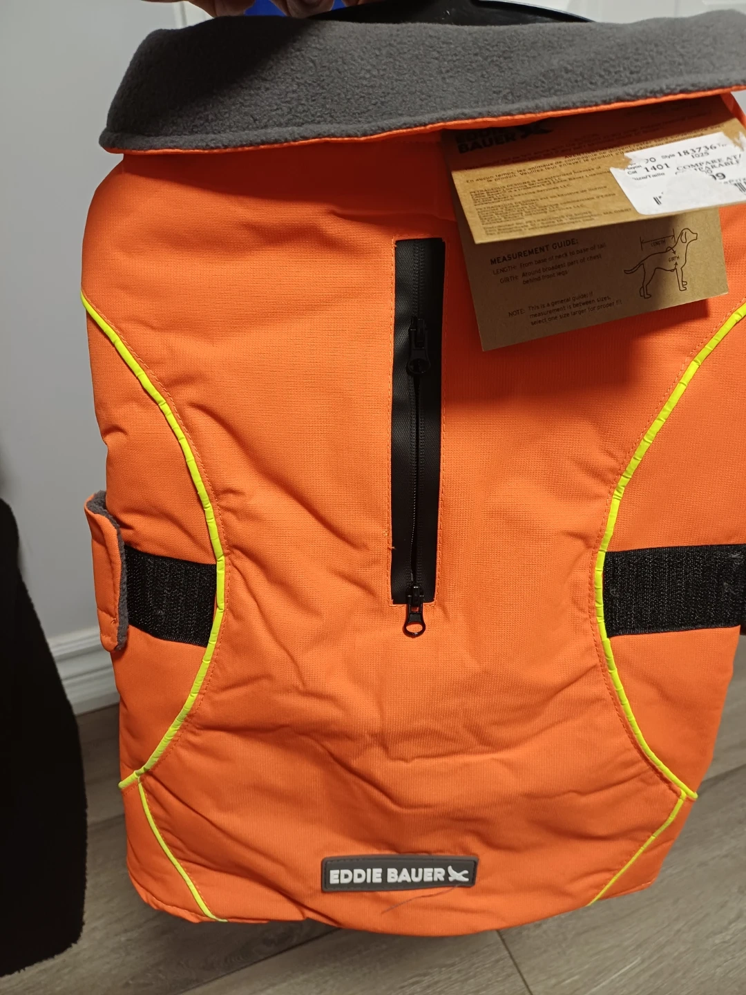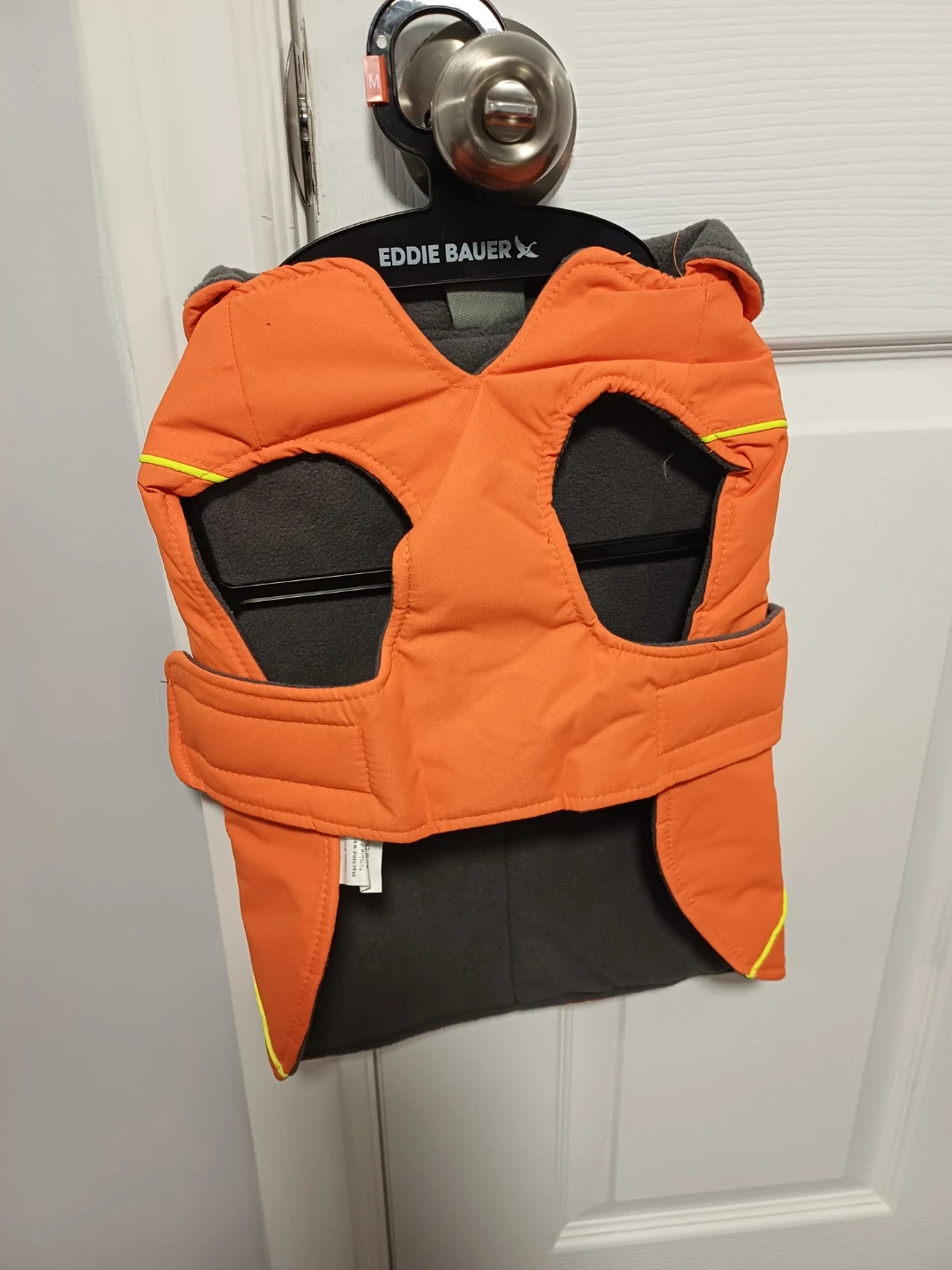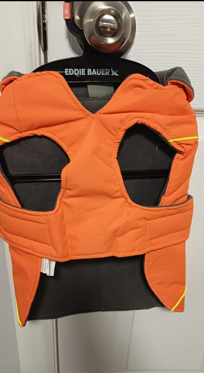 Eddie Bauer Spokane dog vest in a bright orange colour. It's a size medium with reflective trim. Fleece-lined collar for extra warmth. It has adjustable hook-and-loop straps for a secure fit. This vest is great for keeping your dog visible and warm on outdoor adventures!