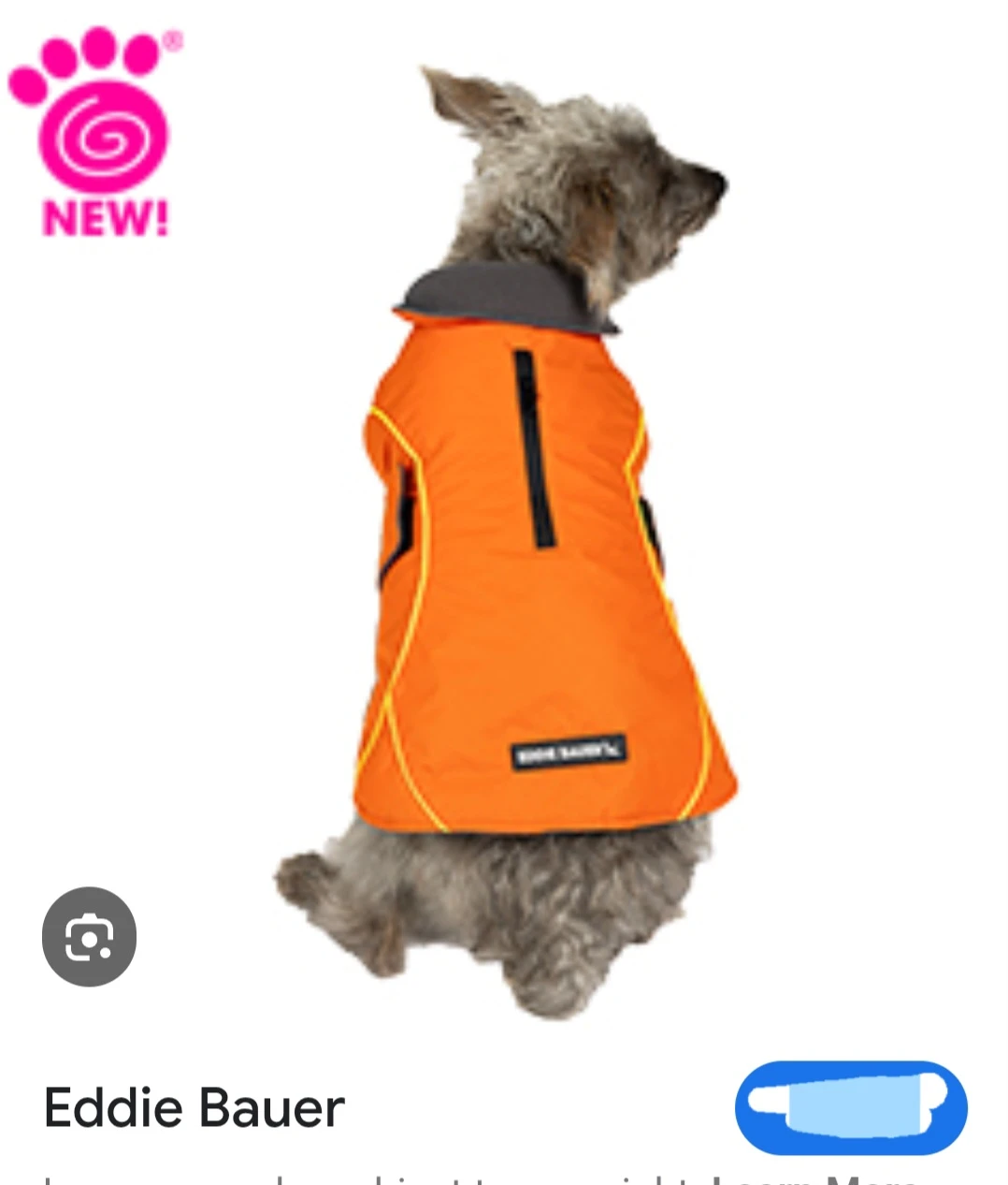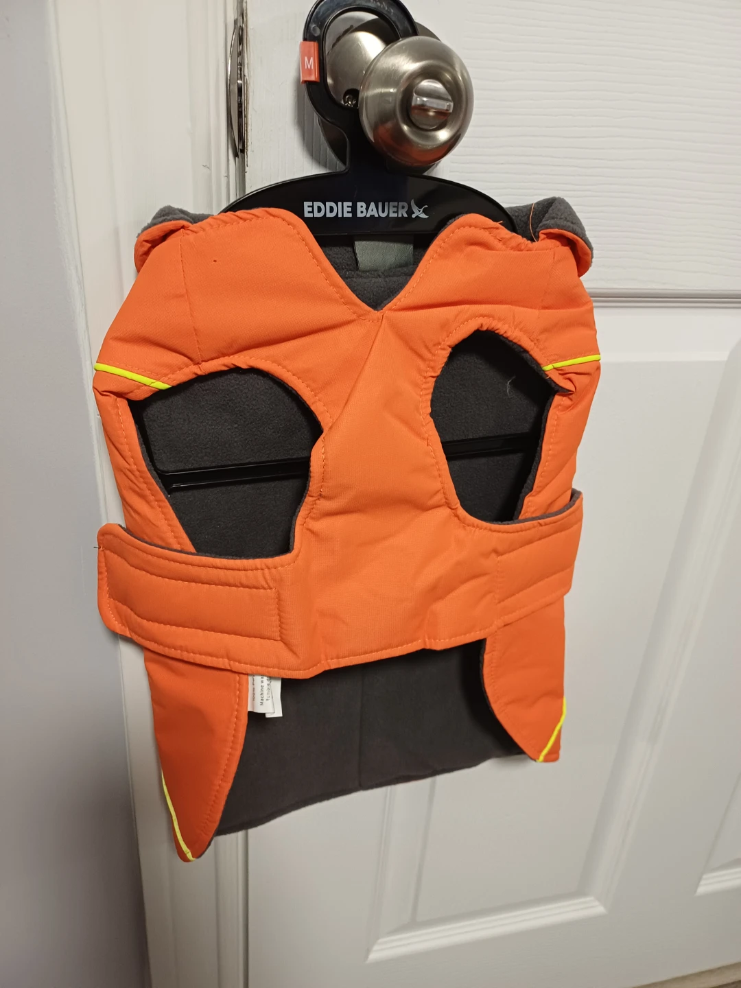 Eddie Bauer Spokane dog vest in a bright orange colour. It's a size medium with reflective trim. Fleece-lined collar for extra warmth. It has adjustable hook-and-loop straps for a secure fit. This vest is great for keeping your dog visible and warm on outdoor adventures!