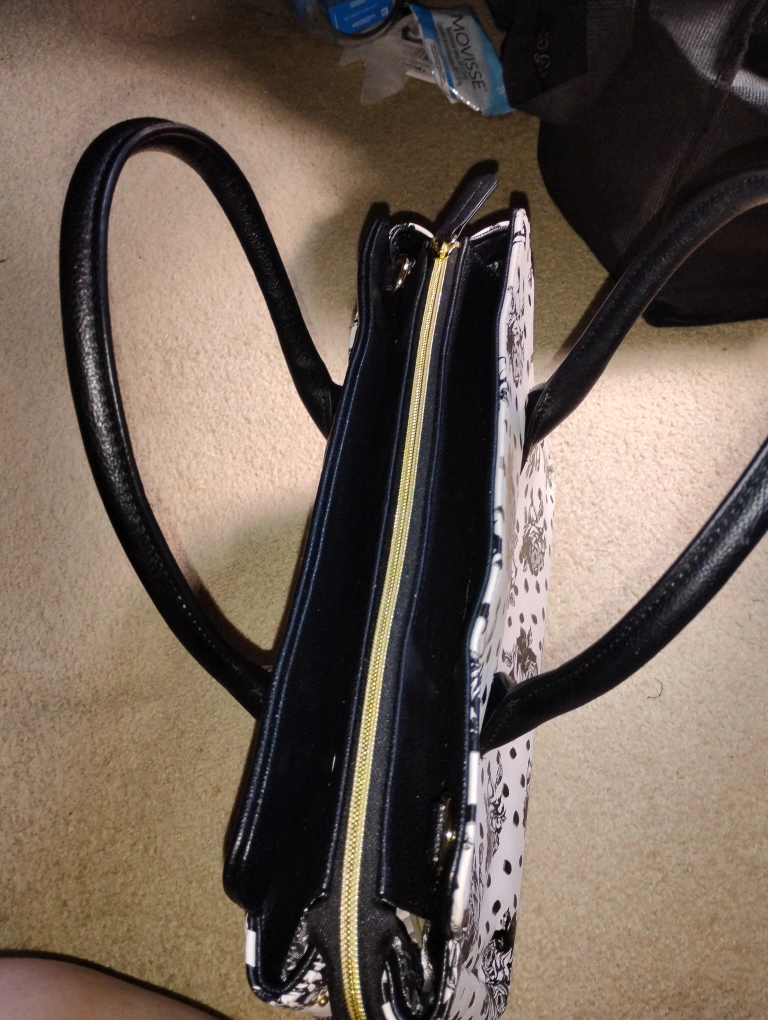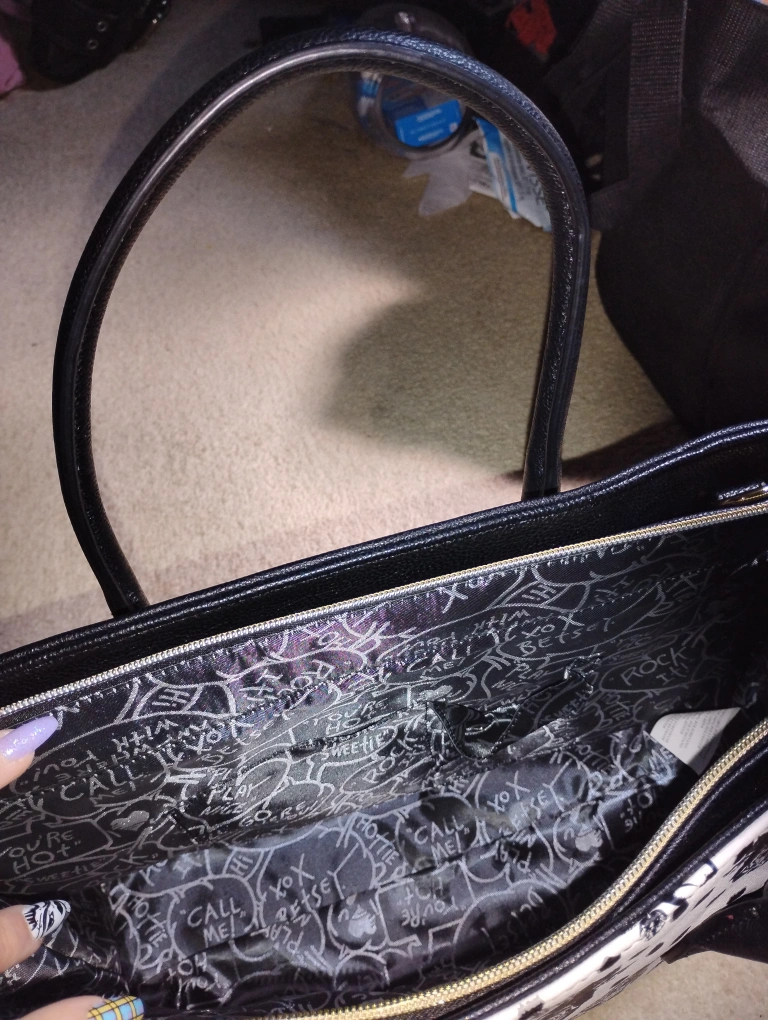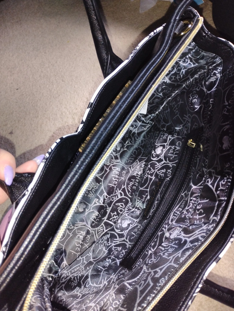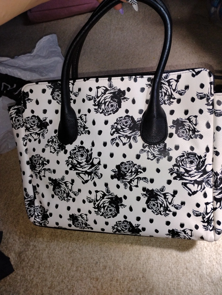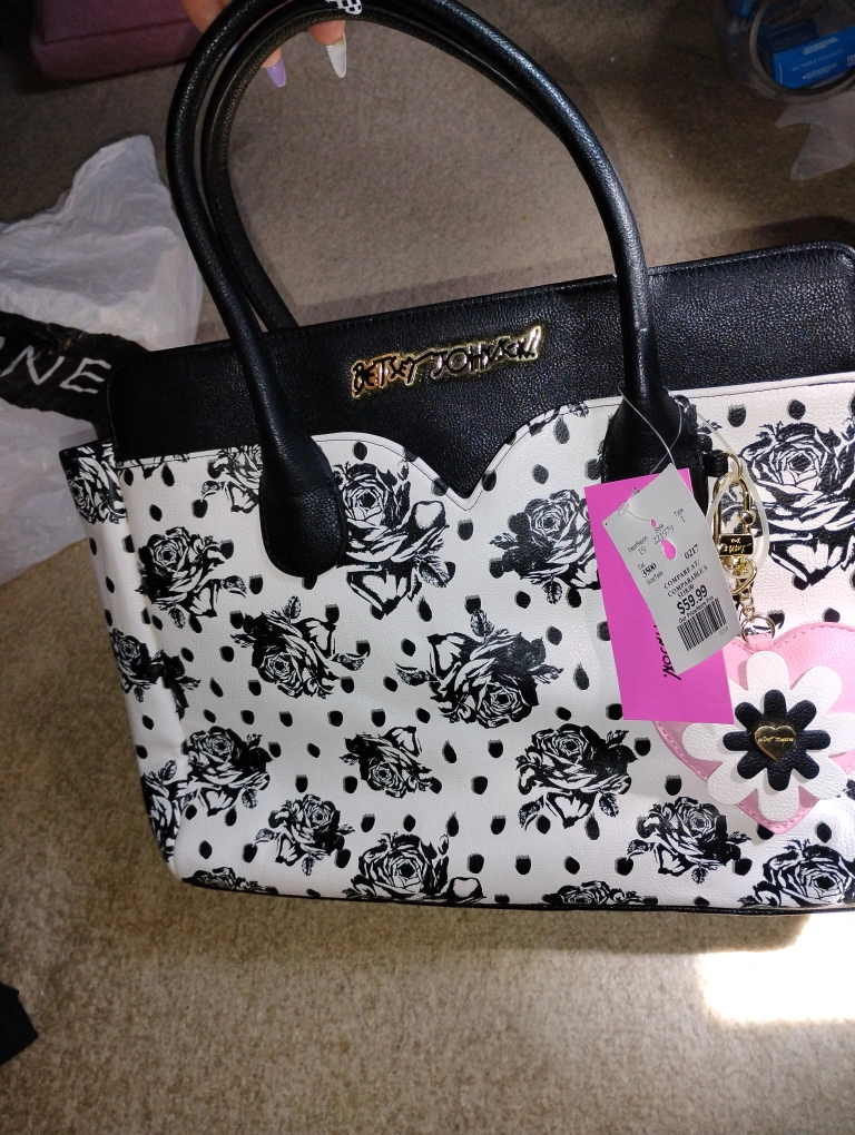 Betsey Johnson white faux leather large capacity purse with black rose detail & heart keychain, interior pockets/interior zipper pocket. Never used still with price tags.