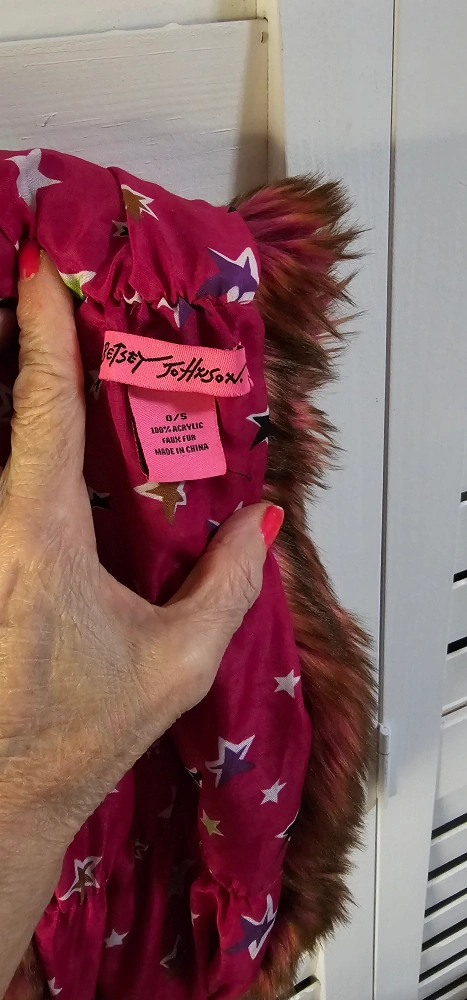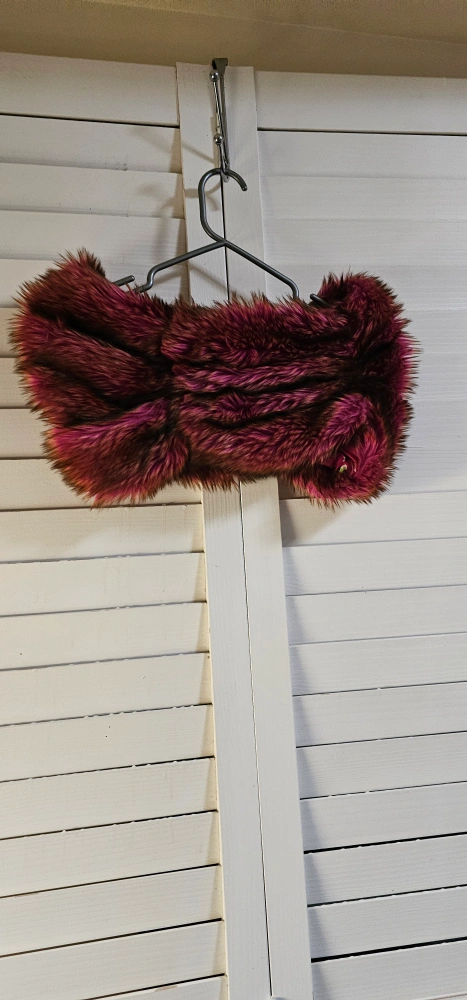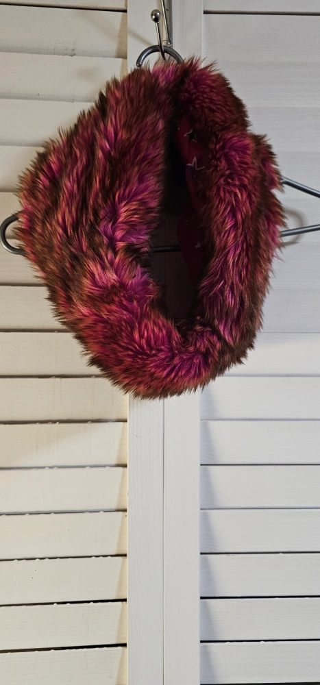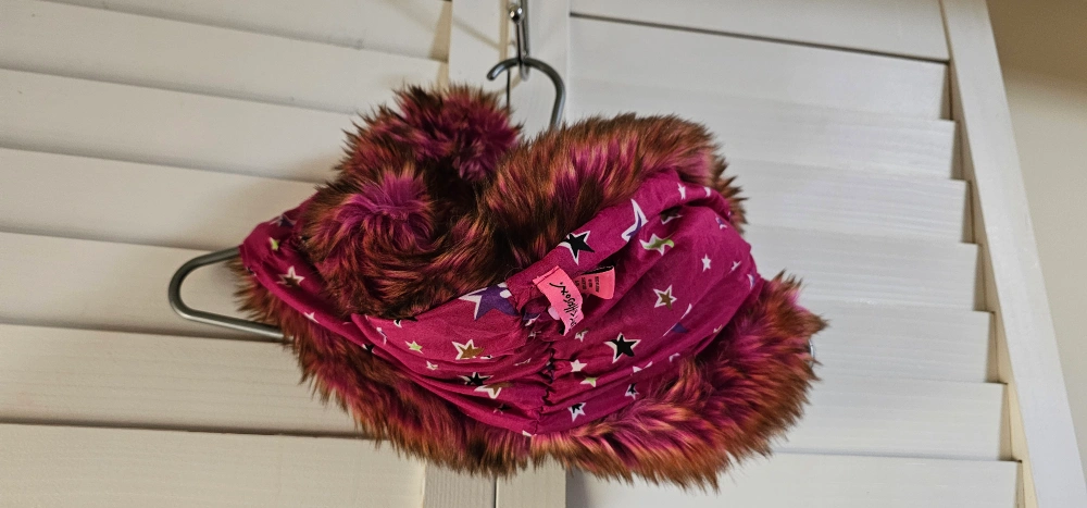 1000+Great condition. Pink and brown faux fur collar. Features a star print lining. Approximate measurements: 21.5 inches wide and 16 inches long.