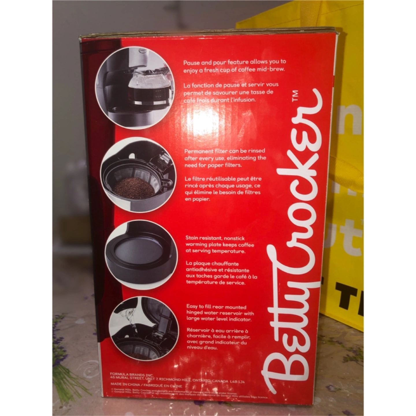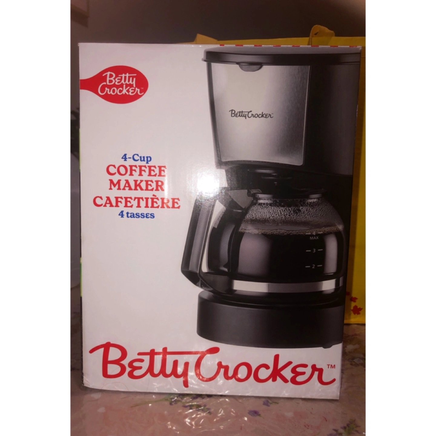 20Selling a Betty Crocker 4-Cup Coffee Maker! It's Completely brand New! and ready to brew your favourite coffee. The pause and pour feature lets you enjoy a fresh cup mid-brew. The permanent filter can be rinsed after each use, eliminating the need for paper filters. The warming plate keeps coffee at serving temperature. Also easy to fill the rear mounted water reservoir with a large water level indicator
