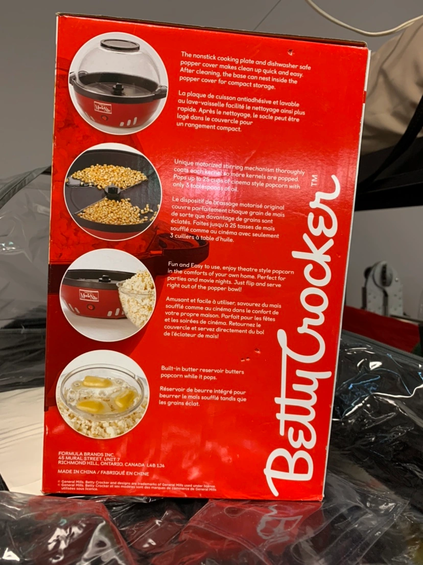 10Brand New! Still in box. Reg price $55 plus tax Red Betty Crocker popcorn maker, makes popcorn in a traditional movie theatre style. The popcorn maker comes with a clear dome lid, and a built in butter reservoir.