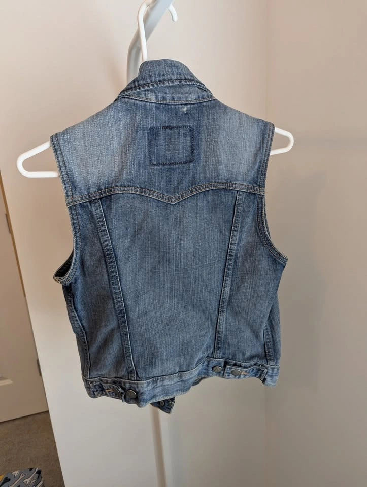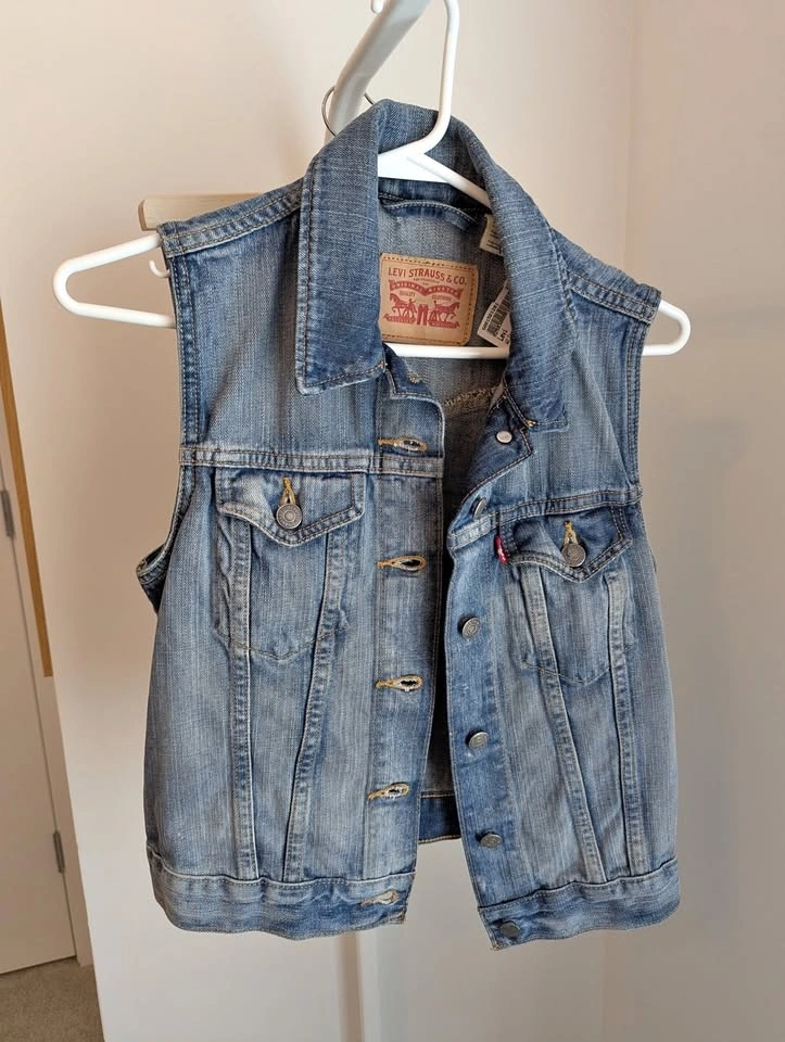Women's Levi's denim vest, size small. Bought for $30 and missed the return window, it is too small for me! Distressed in appearance but no damage. Asking $20, pickup near Langley Costco.
