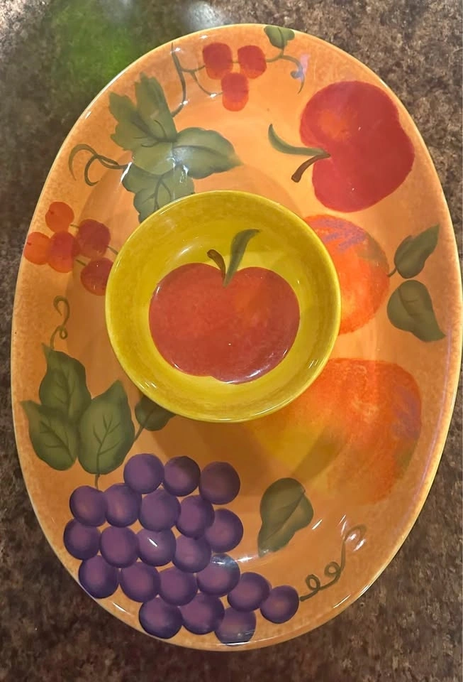 The collection features a vibrant, hand-painted fruit motif—including grapes, apples, and pears—on an orange or yellow background. Dishwasher and microwave safe.