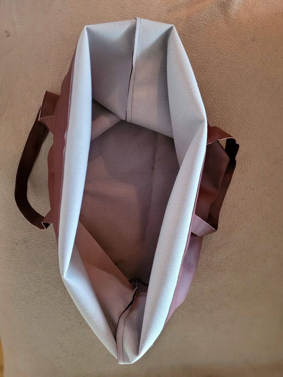 Here's a simple brown tote bag in good condition. It's perfect for carrying groceries or everyday essentials. The material is durable and easy to clean, making it a practical choice for daily use