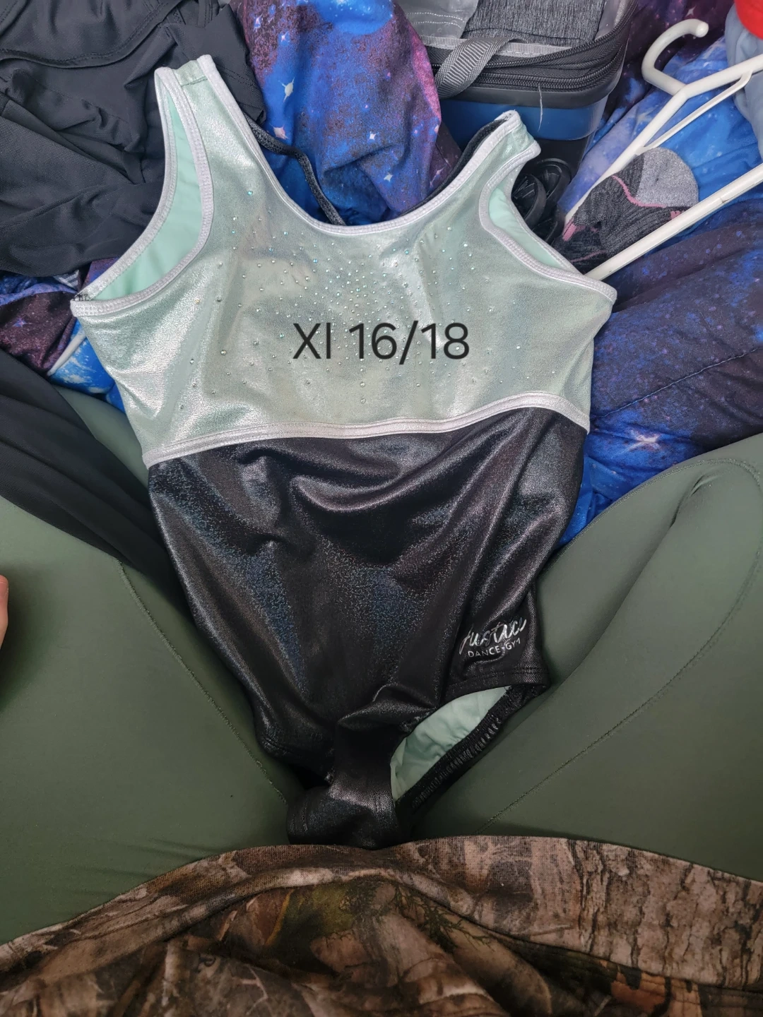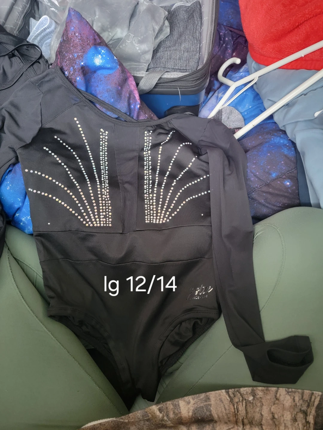 Three girls' gymnastics leotards in size 16/18. Features a black long-sleeve with rhinestones, a pink/blue tie-dye with rhinestones, and a mint/black metallic design. These are perfect for practice or competition!