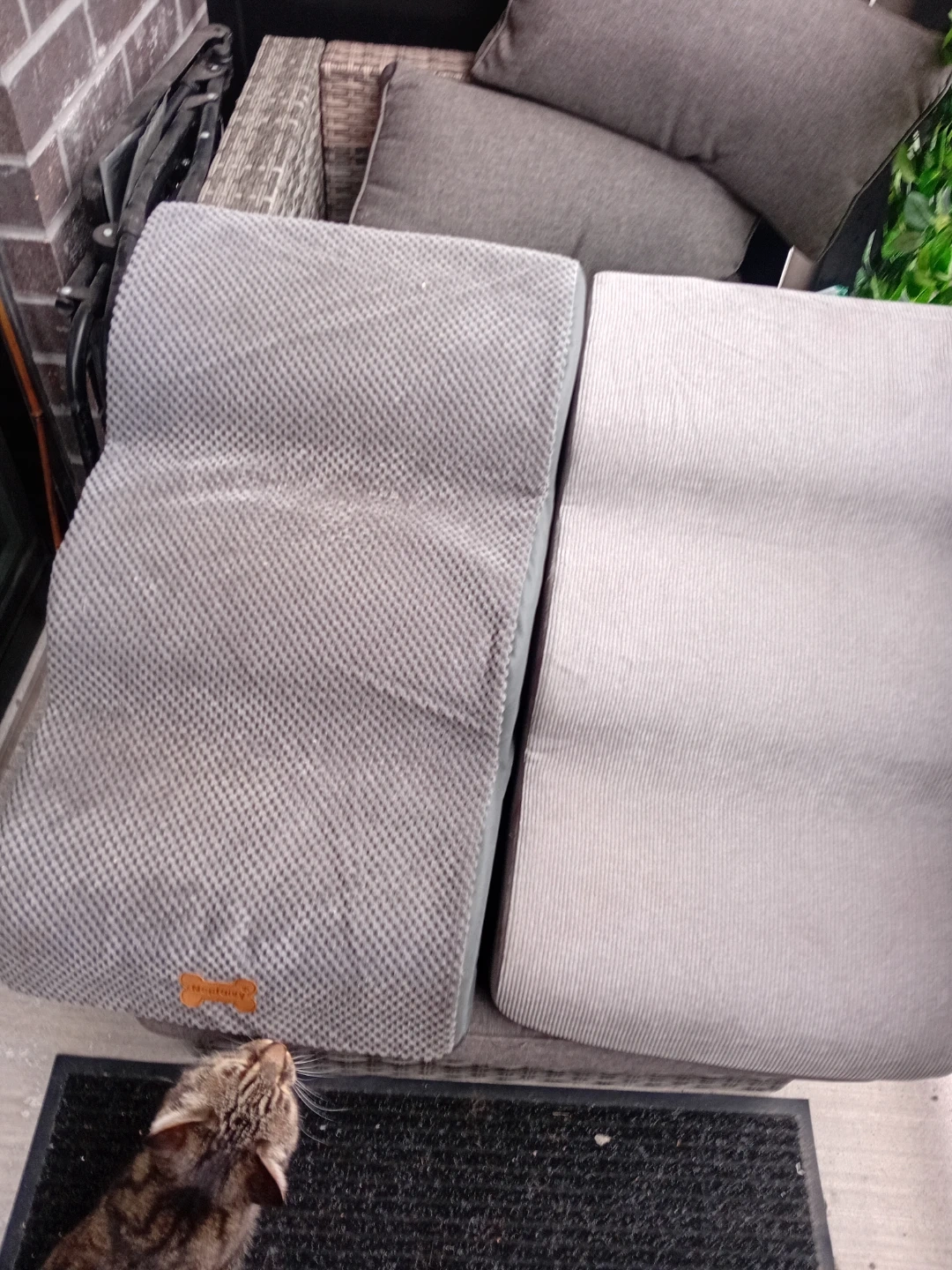 Two soft, grey pet bed cushions. It features a textured top and a striped bottom. Perfect for your furry friend! 15"h x22"l x18"w