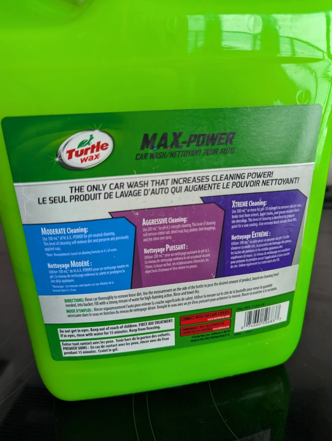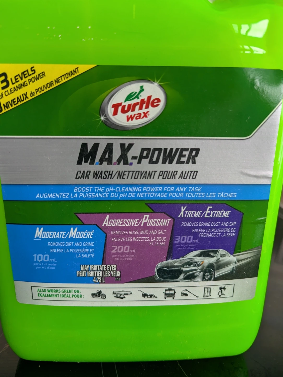 Turtle Wax MAX-POWER Car Wash is for any task. It comes in a large 3.78L jug. This car wash increases cleaning power for tough jobs like removing bugs, mud, and brake dust.