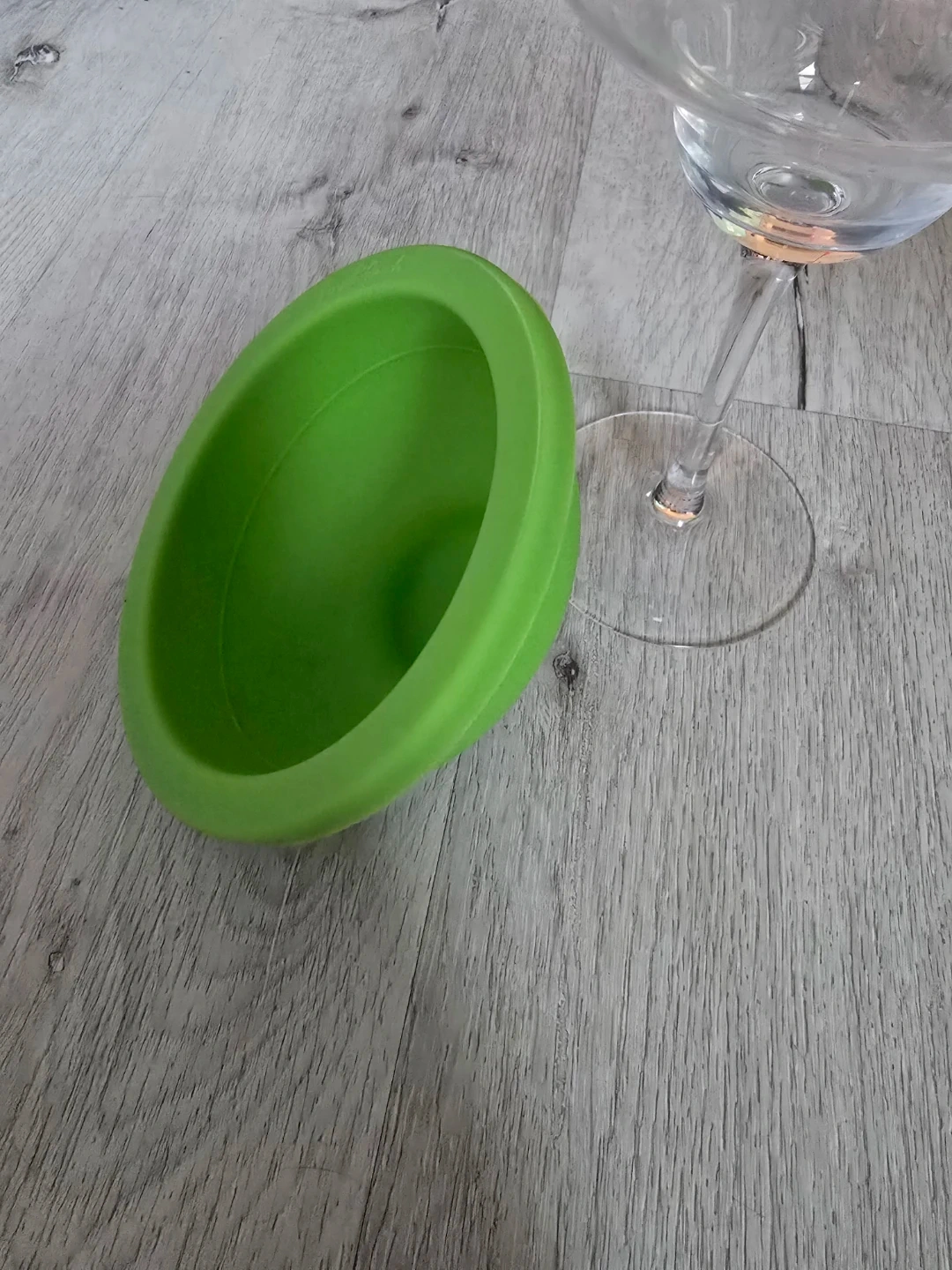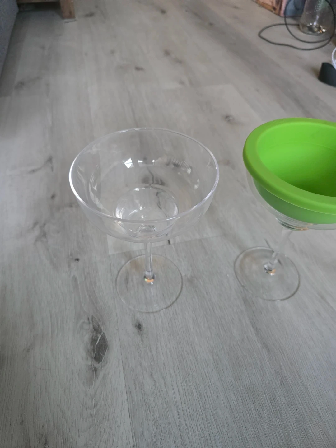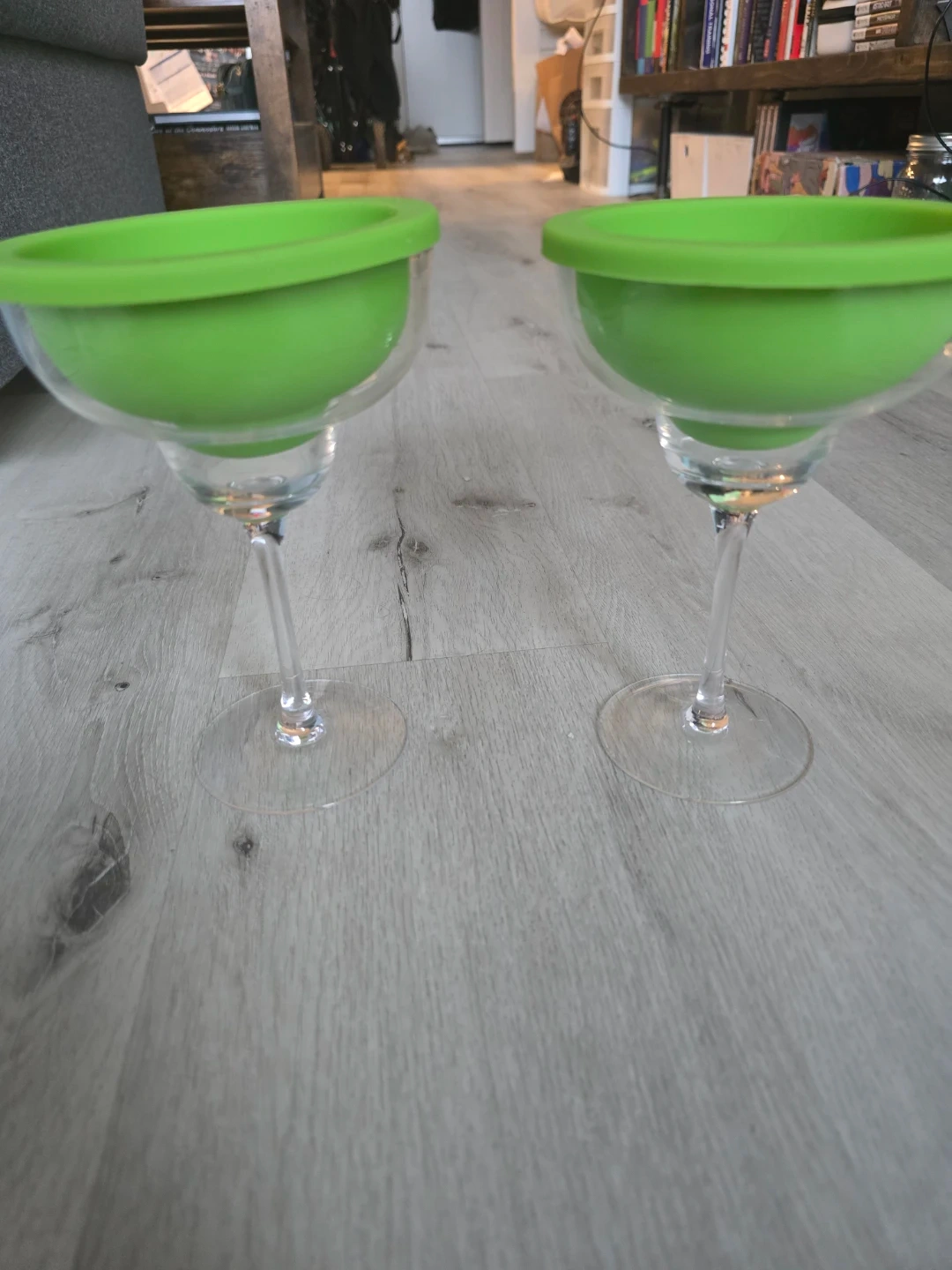 Two margarita glasses featuring removable bright green silicone inserts. These glasses are great for serving frozen or blended drinks. Silicone inserts are to mould ice down the walls for the glass for an always cold cocktail!