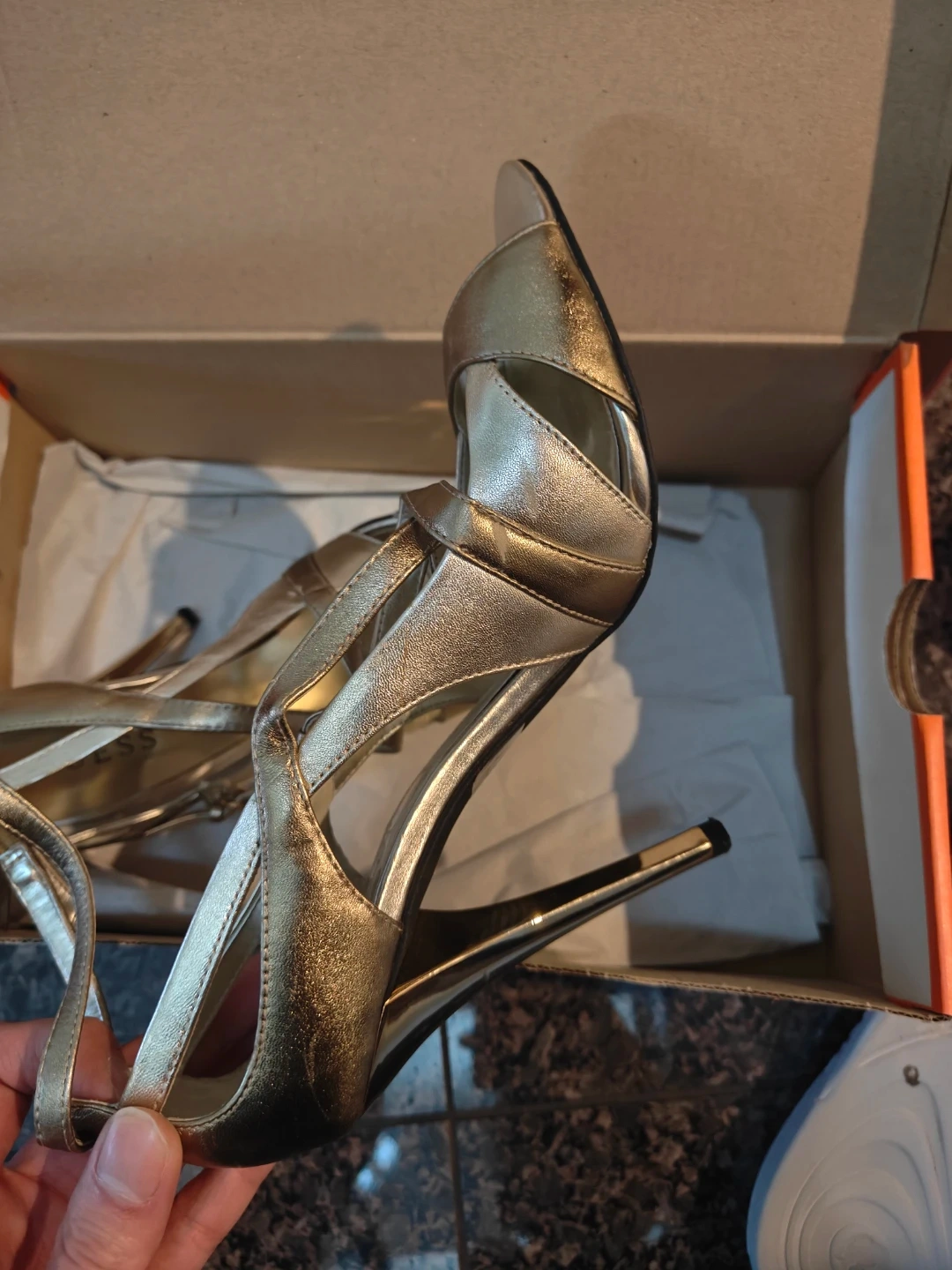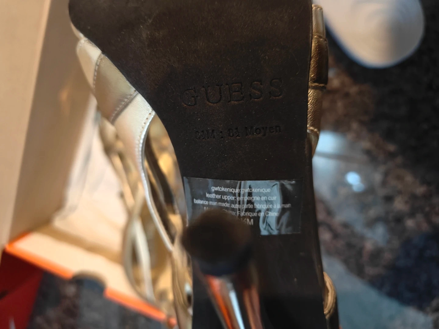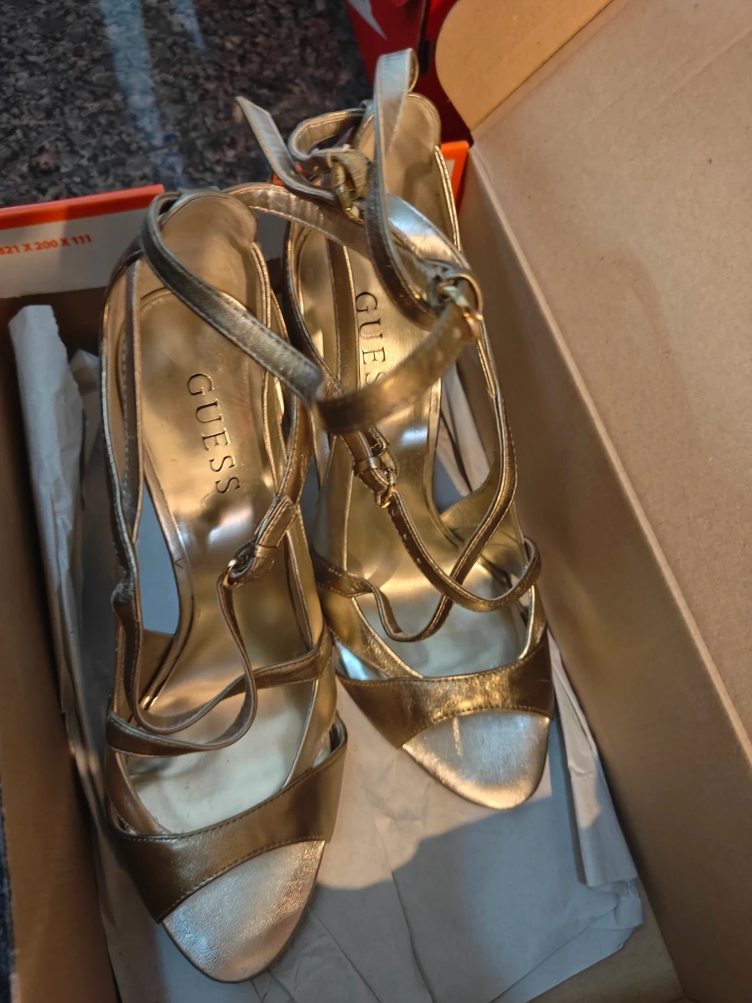 Selling a pair of Guess gold heels in size 8.5M. They come in the original box and are in great condition! The material is leather upper. Perfect for a night out or a special occasion