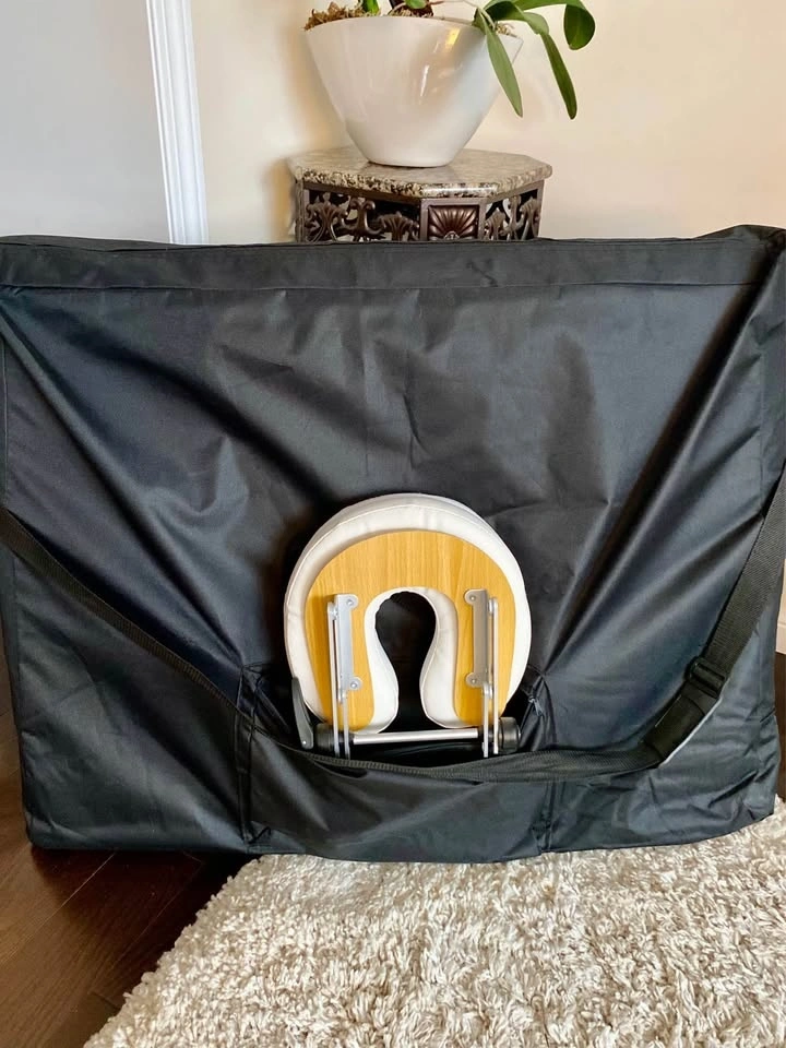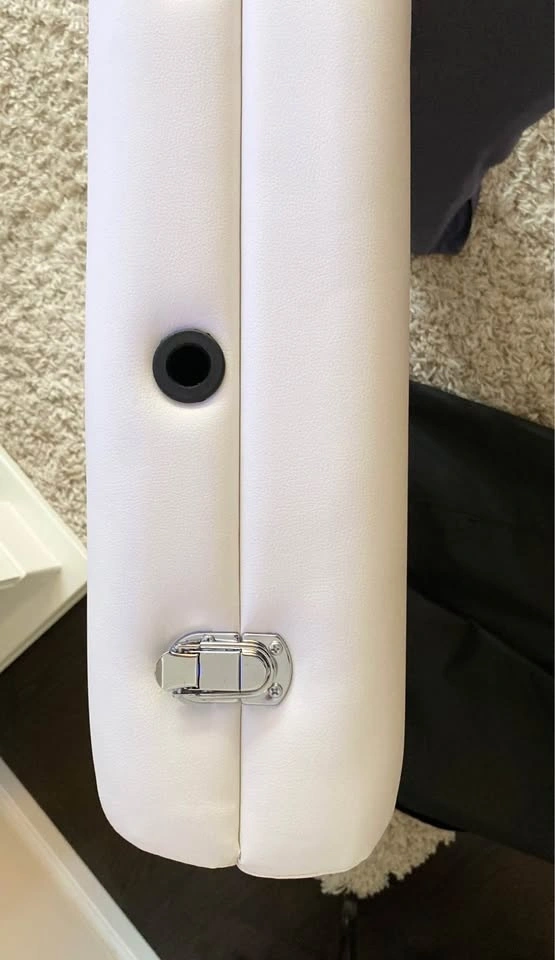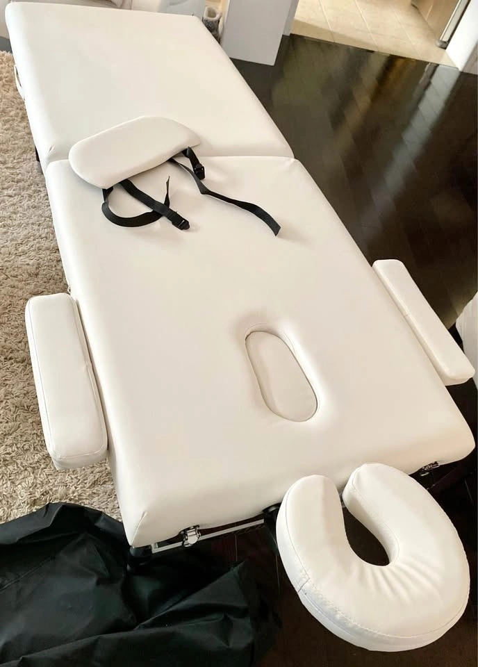 Bed is New: Size: 84” long with headrest, 64” without, 27” wide, arm rests 14” long each. Weight capacity: 550lb. Frame: Sturdy, folding massage bed (folds in half), aluminum frame, 8 adjustable heights, has a face cradle, adjustable and removable head rest, removable arm rests on sides and hand rest when face down under head rest. Includes carrying bag. Table's Weight: 13.6 kg. Material: white PVC.