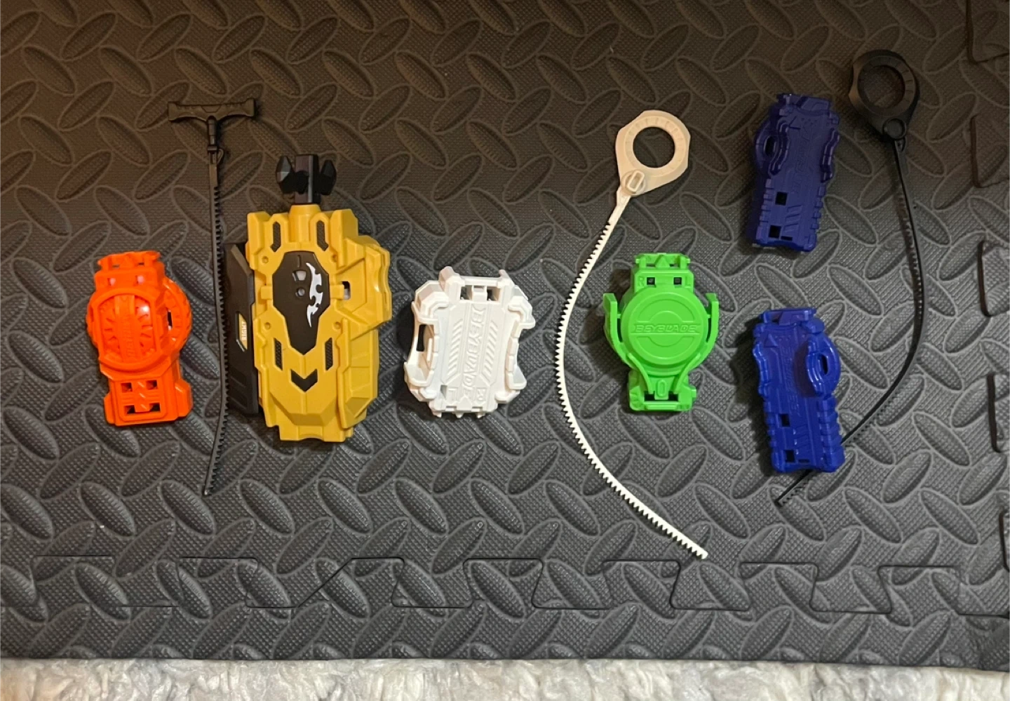 68Selling a lot of Beyblade launchers! There are multiple colours and styles. Great for anyone getting into Beyblades. Gold/yellow can do both right and left launch, same with white green and orange. Blue launcher can only launch right, the blue one can be connected and launch two beyblades at a time. All of it is in good condition and used. 5 dollars each launcher 20 dollars for all. Each launcher is about 10 dollars online.