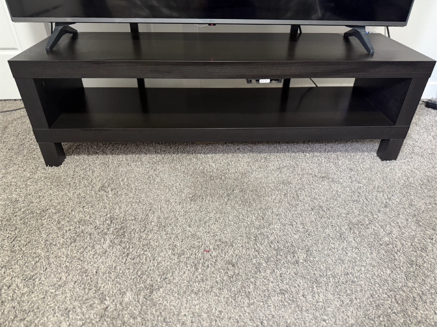 This dark brown TV stand has a spacious top and an open shelf below for media consoles or storage. It's made of a laminate wood material. Suitable for most living rooms or bedrooms.