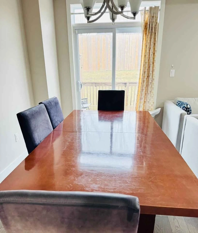Moving sale! Selling this high-quality, solid wood dining table set. This is a heavy, sturdy piece, not particleboard or IKEA. Perfect for a family of 4 or a modern apartment space. Includes: 1 Solid Wood Table with a beautiful warm chestnut finish and a modern pedestal base. 4 Upholstered Chairs in a comfortable, high-back charcoal/grey fabric. All are in great structural condition with no wobbles. Table size: 79" x 44". Must be able to pick up. The tabletop is solid wood, so please bring a second person to help with loading.