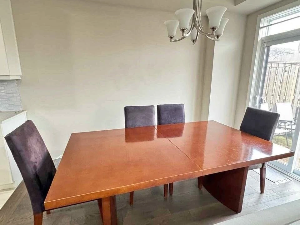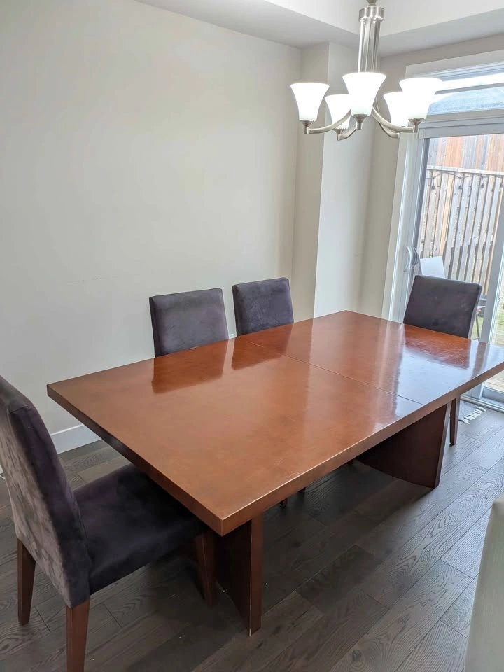 Moving sale! Selling this high-quality, solid wood dining table set. This is a heavy, sturdy piece, not particleboard or IKEA. Perfect for a family of 4 or a modern apartment space. Includes: 1 Solid Wood Table with a beautiful warm chestnut finish and a modern pedestal base. 4 Upholstered Chairs in a comfortable, high-back charcoal/grey fabric. All are in great structural condition with no wobbles. Table size: 79" x 44". Must be able to pick up. The tabletop is solid wood, so please bring a second person to help with loading.