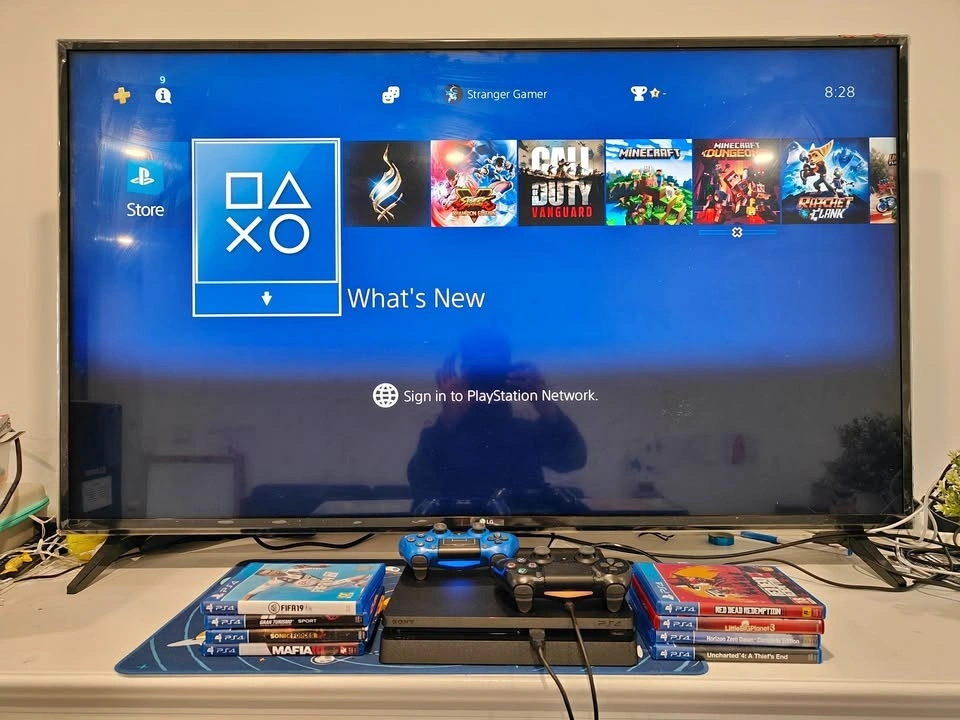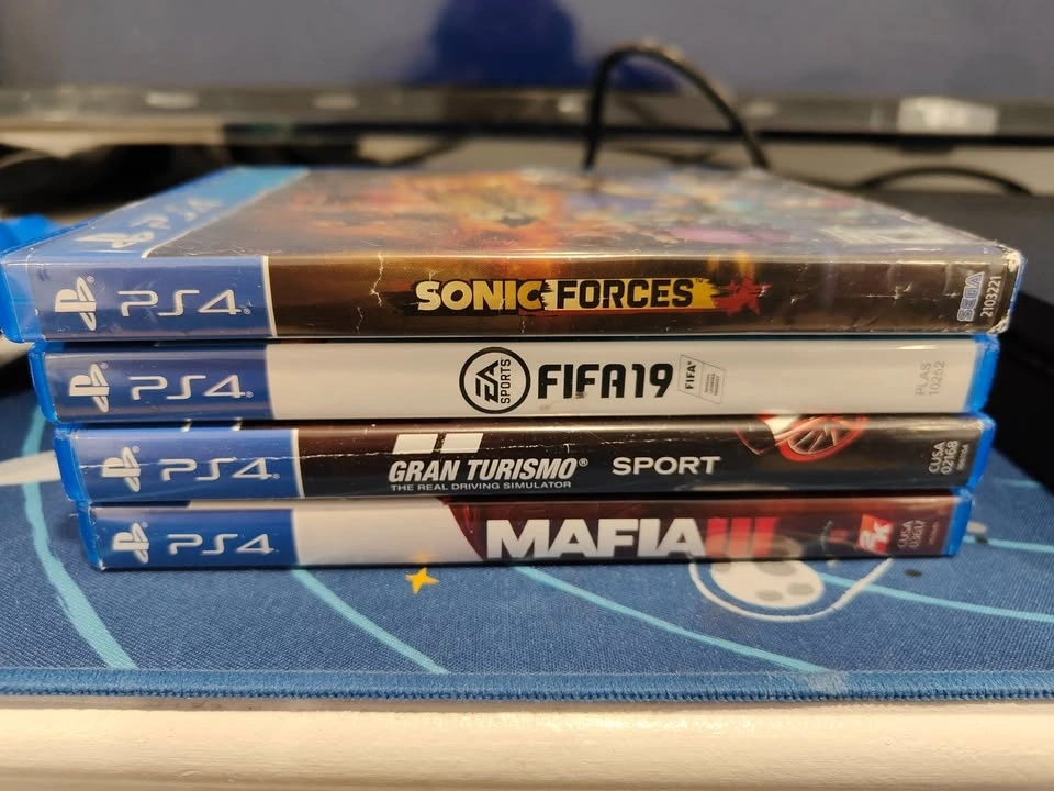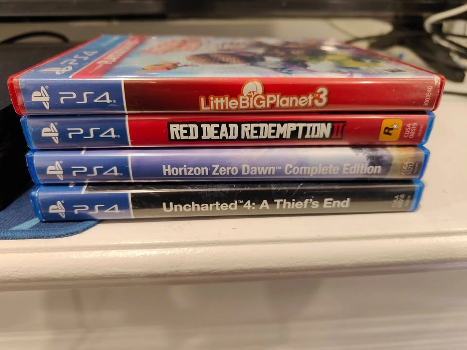 PS4 Slim in great working condition with 500GB internal storage. Includes 2 original controllers and 8 games — ready to play. Works perfectly except one controller has some drift. Includes: PS4 Slim console (500GB), 2 controllers, 8 games, Power cable.