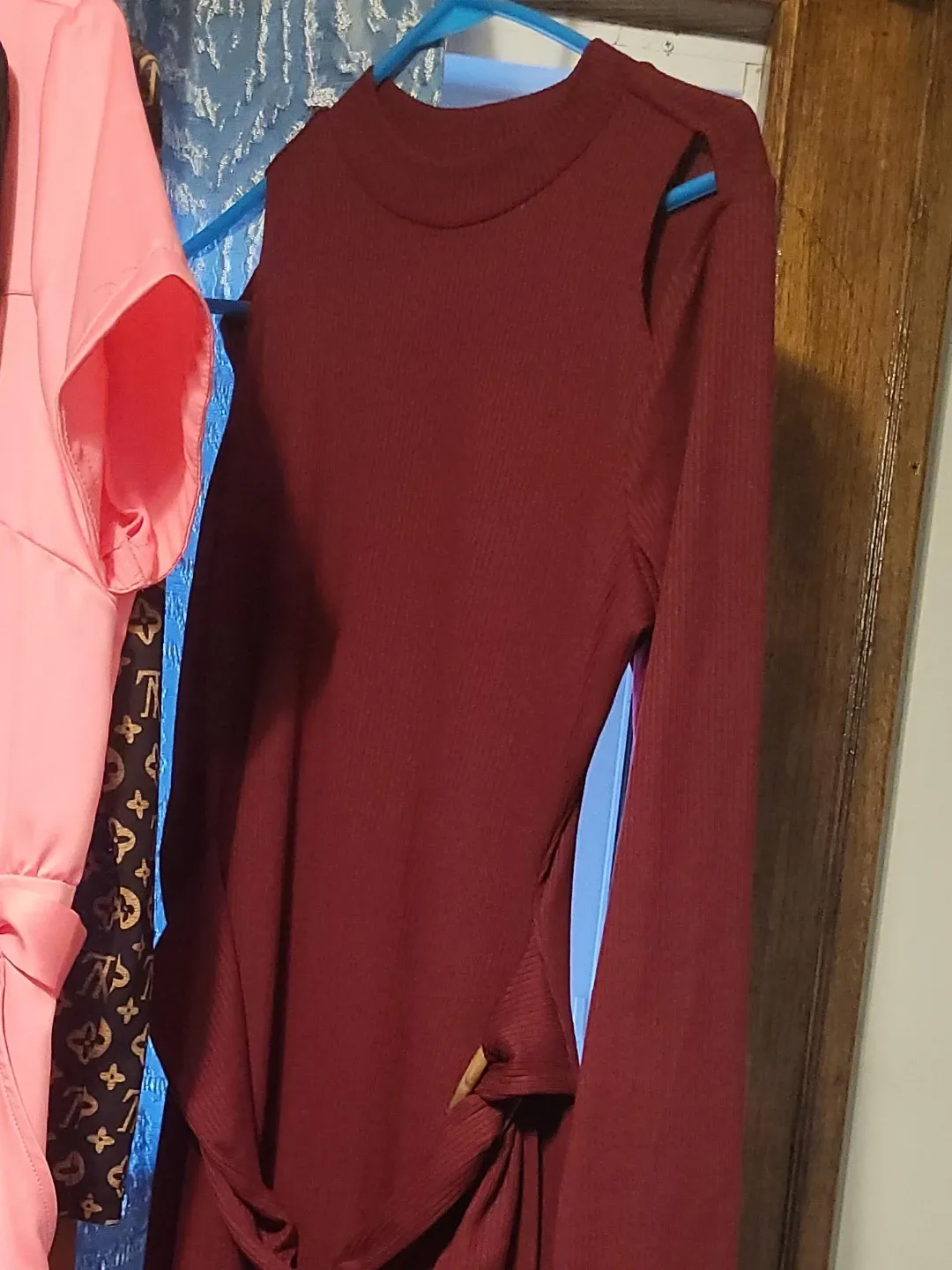 Here's a burgundy long-sleeve dress! It's in great condition and ready for a new owner. The dress features a unique shoulder cut-out design and a flattering tie at the waist. Perfect for a night out or a special occasion