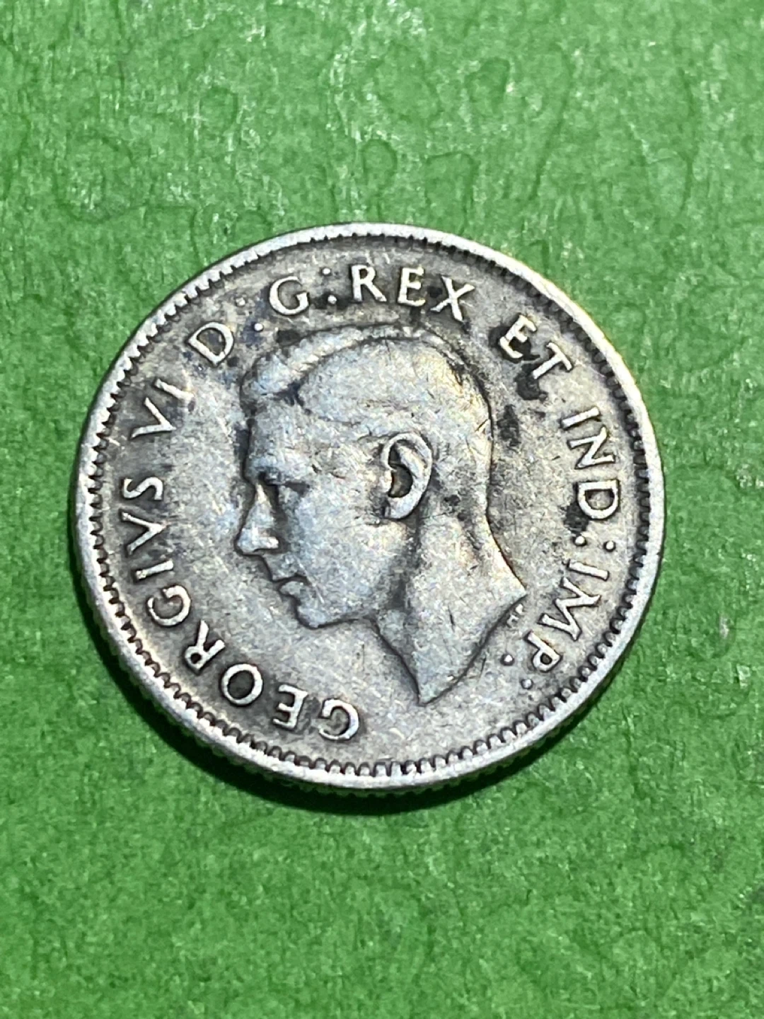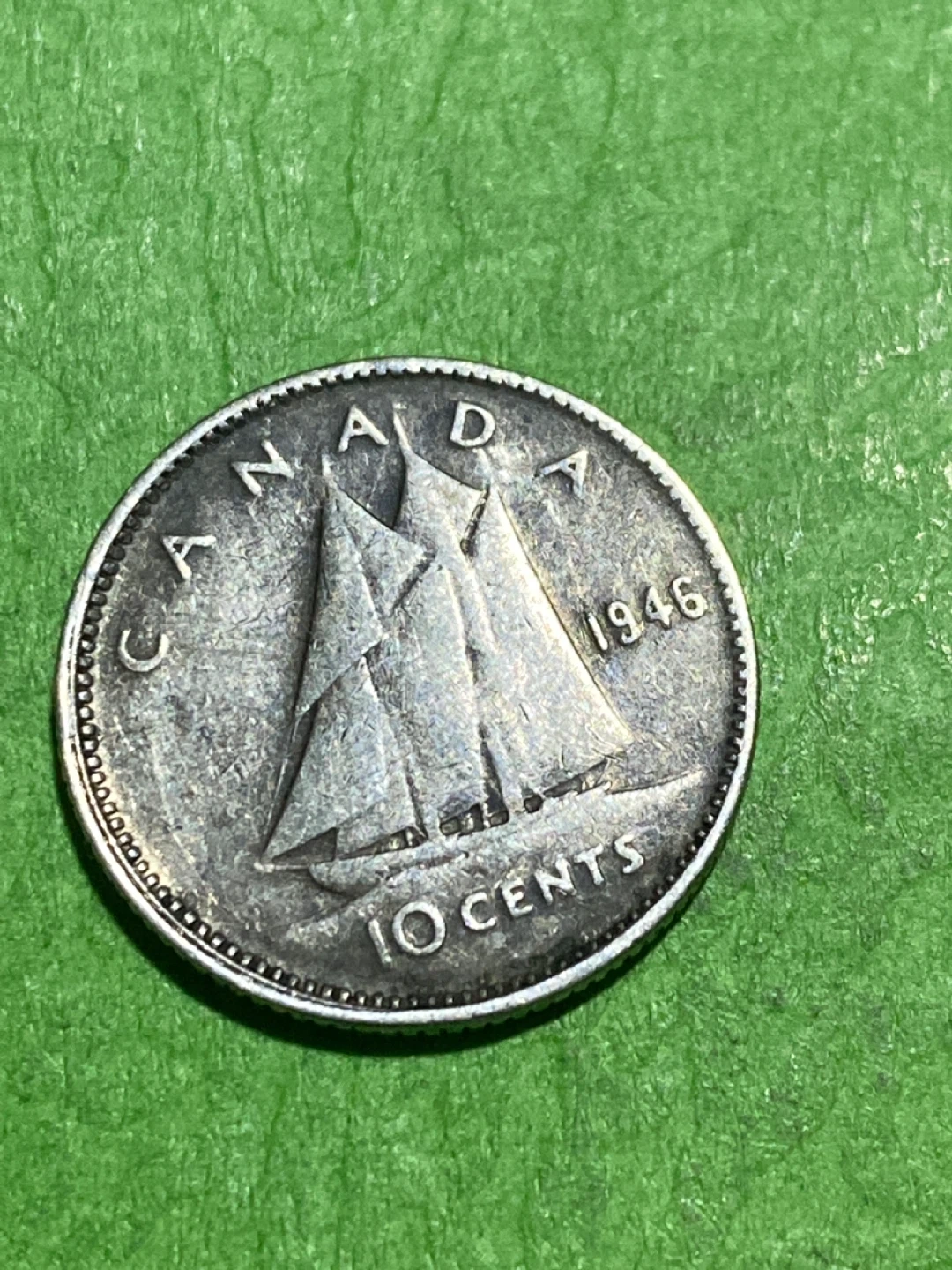 Vintage Canadian dime from 1946, featuring King George VI on the obverse and a schooner on the reverse. This coin is a neat piece of Canadian history. Made of silver.