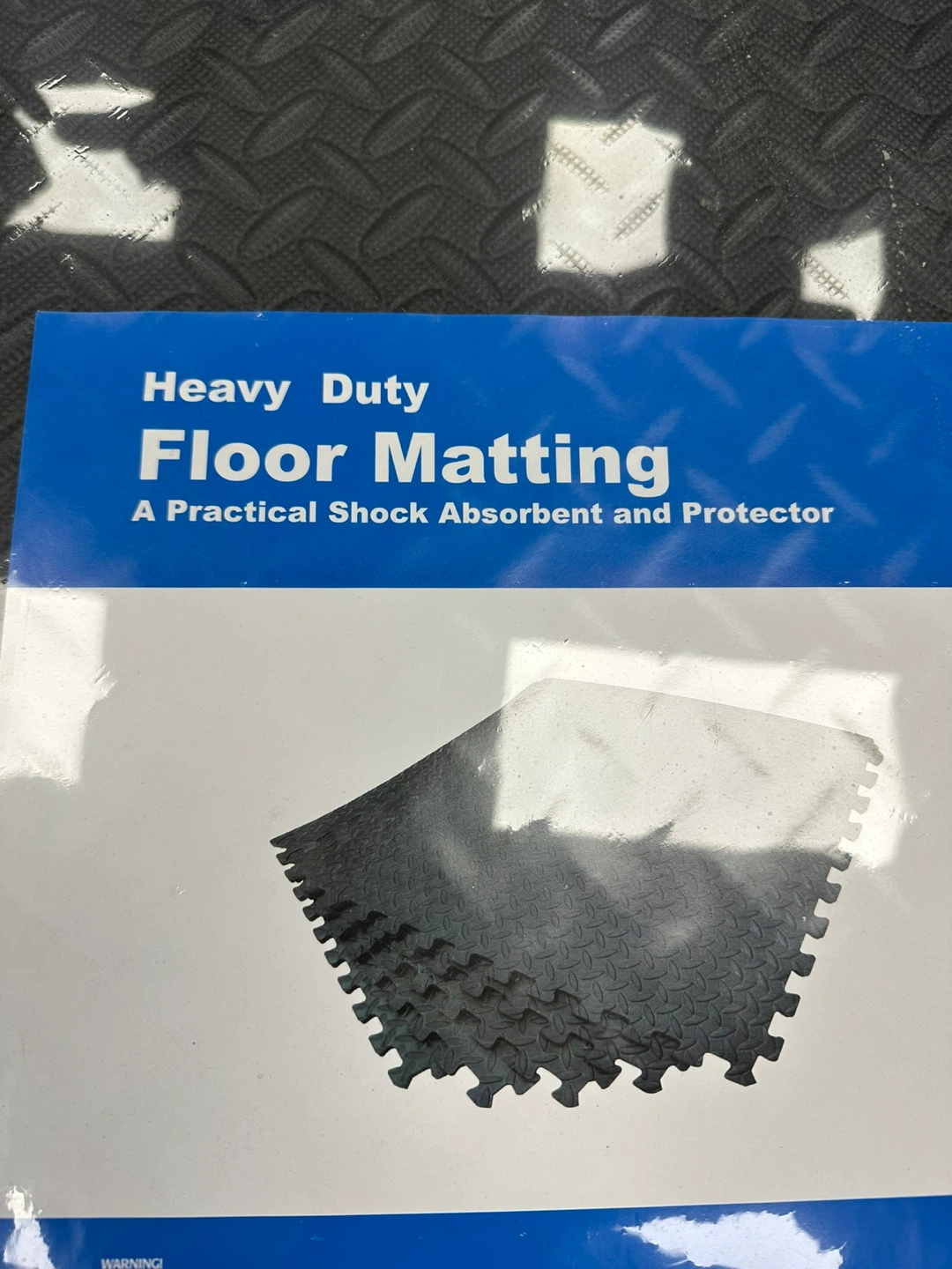 Selling a pack of heavy-duty floor matting, still in its original packaging! This set includes 6 mats, each measuring 2'x2', along with 12 border pieces. The mats are 1/2" thick and made of solid EVA foam. They're great for providing a practical shock-absorbent and protective surface!