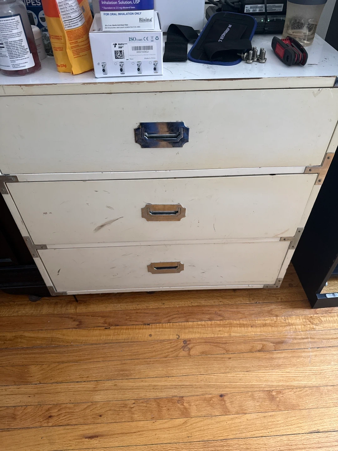 Vintage metal filing cabinet with three drawers. Cream color with silver hardware. Great for storage in an office or home. Some wear consistent with age.