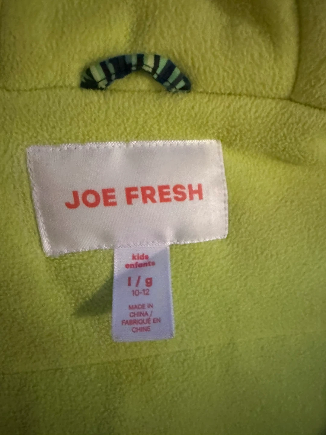 This is a Joe Fresh kids jacket in size L/G, fitting ages 10-12. This jacket is great for cooler weather and keeping kids warm on the go!