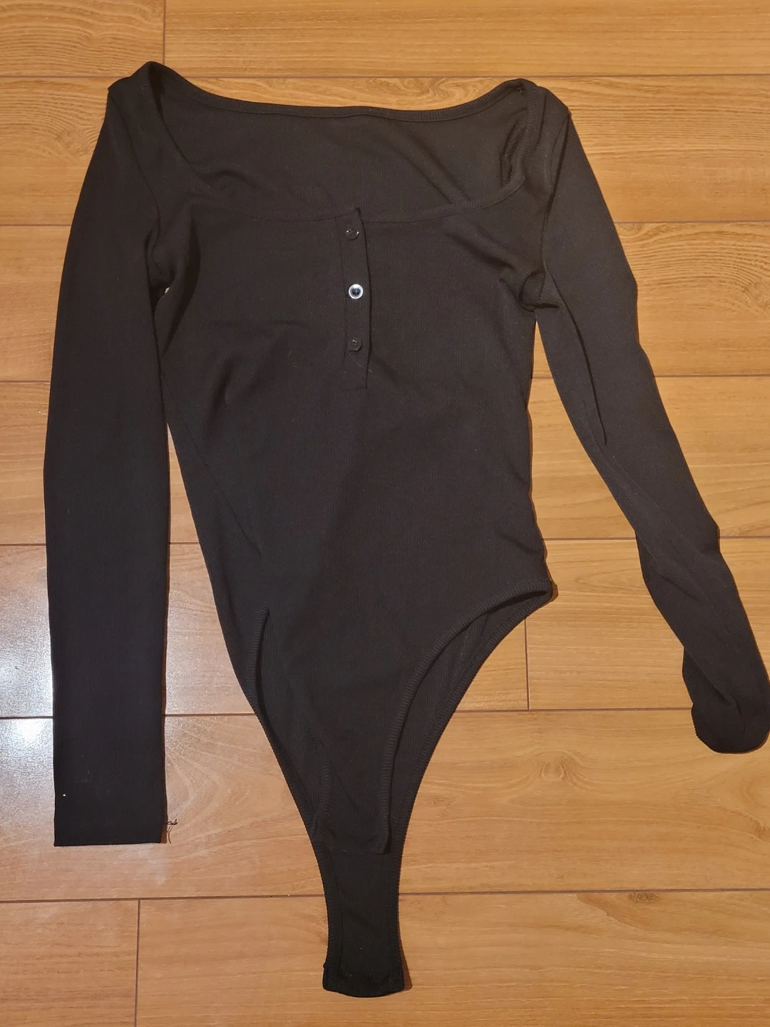 A black long-sleeve bodysuit with a ribbed texture. It has a scoop neckline and a button-up detail at the front. Material is stretchy.