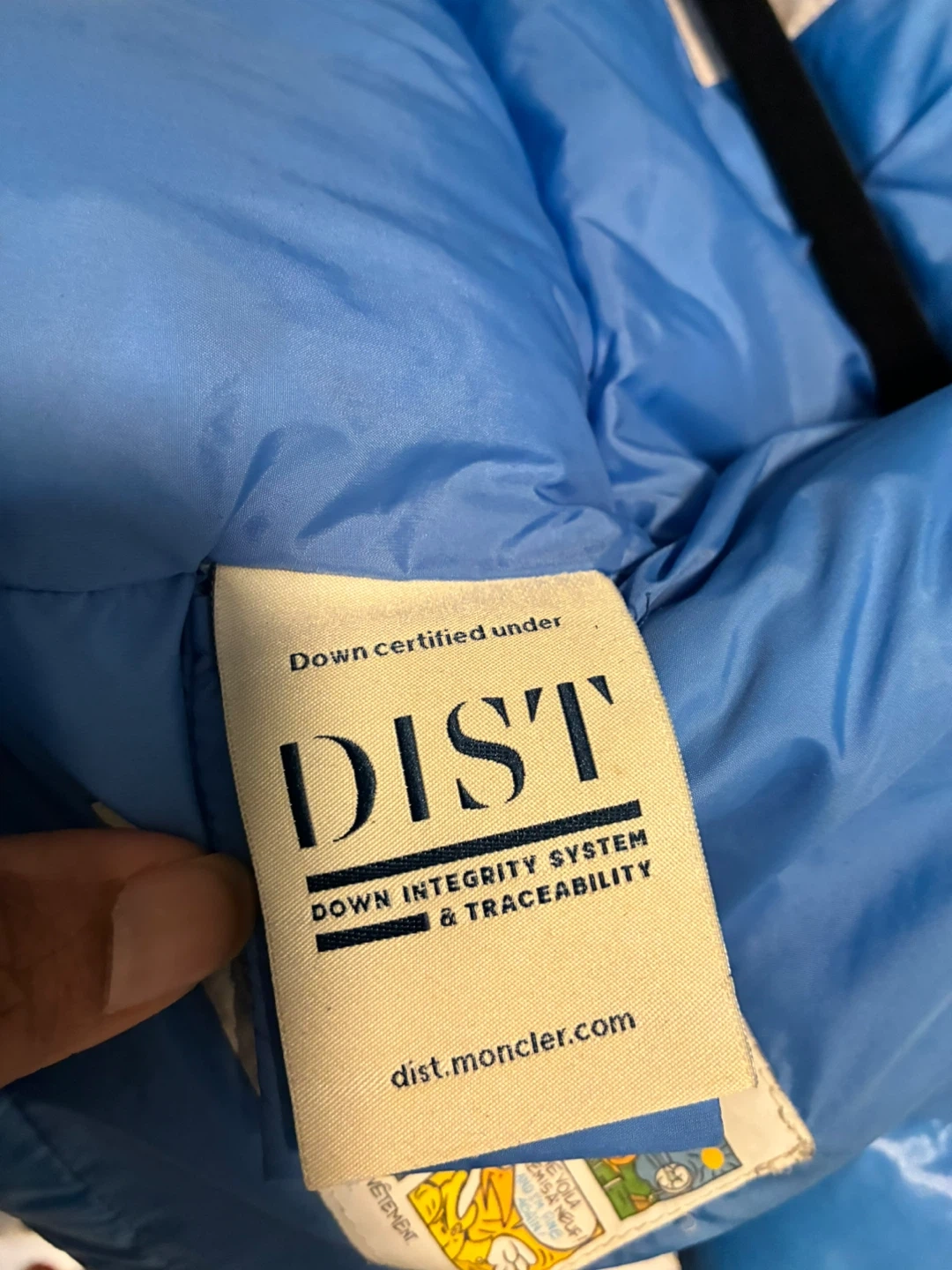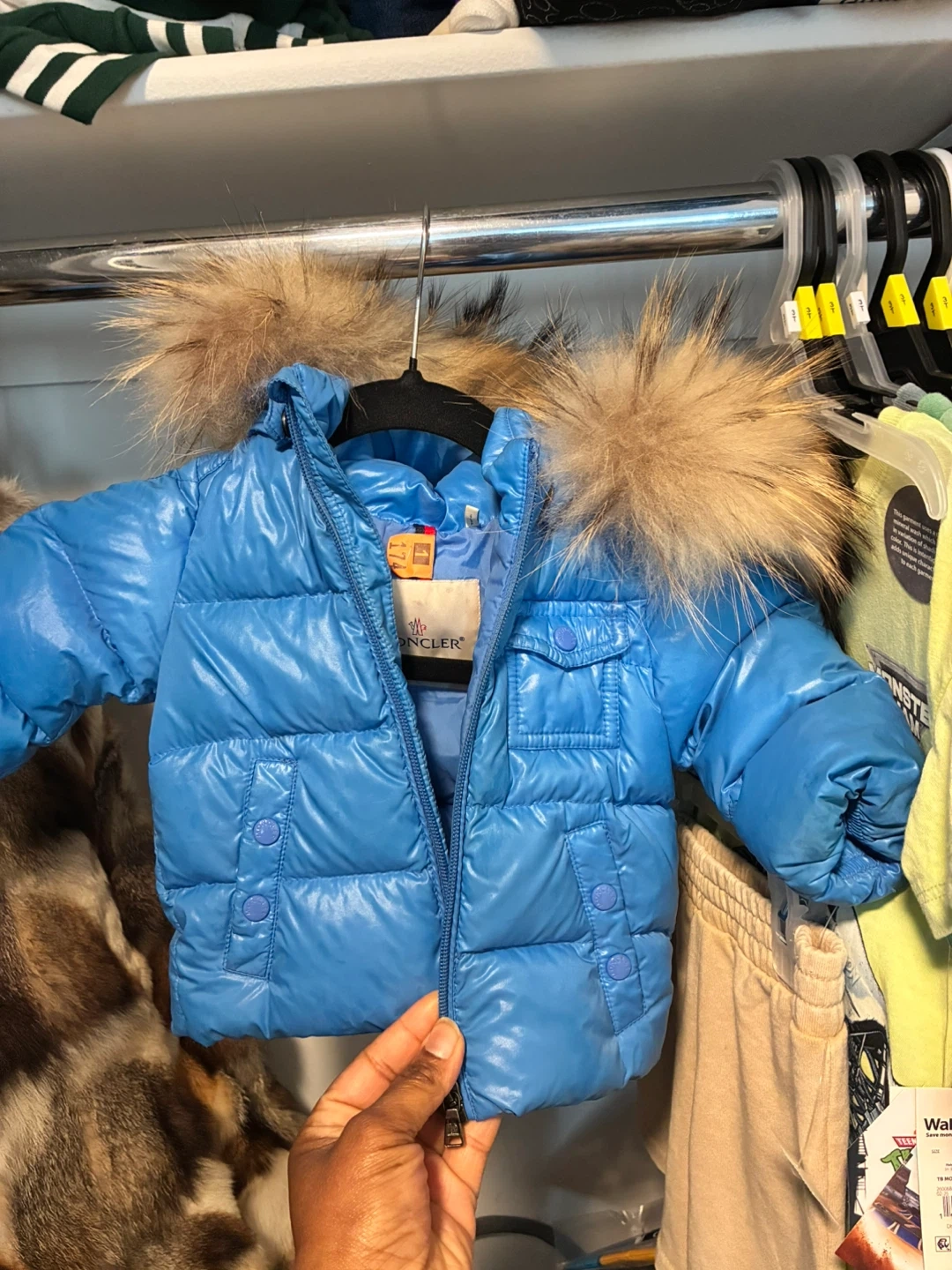 This blue Moncler puffer jacket is filled with white goose down. It features a cozy fur-lined hood. Easy to wash and care for following provided instructions. Size 6-9 months.