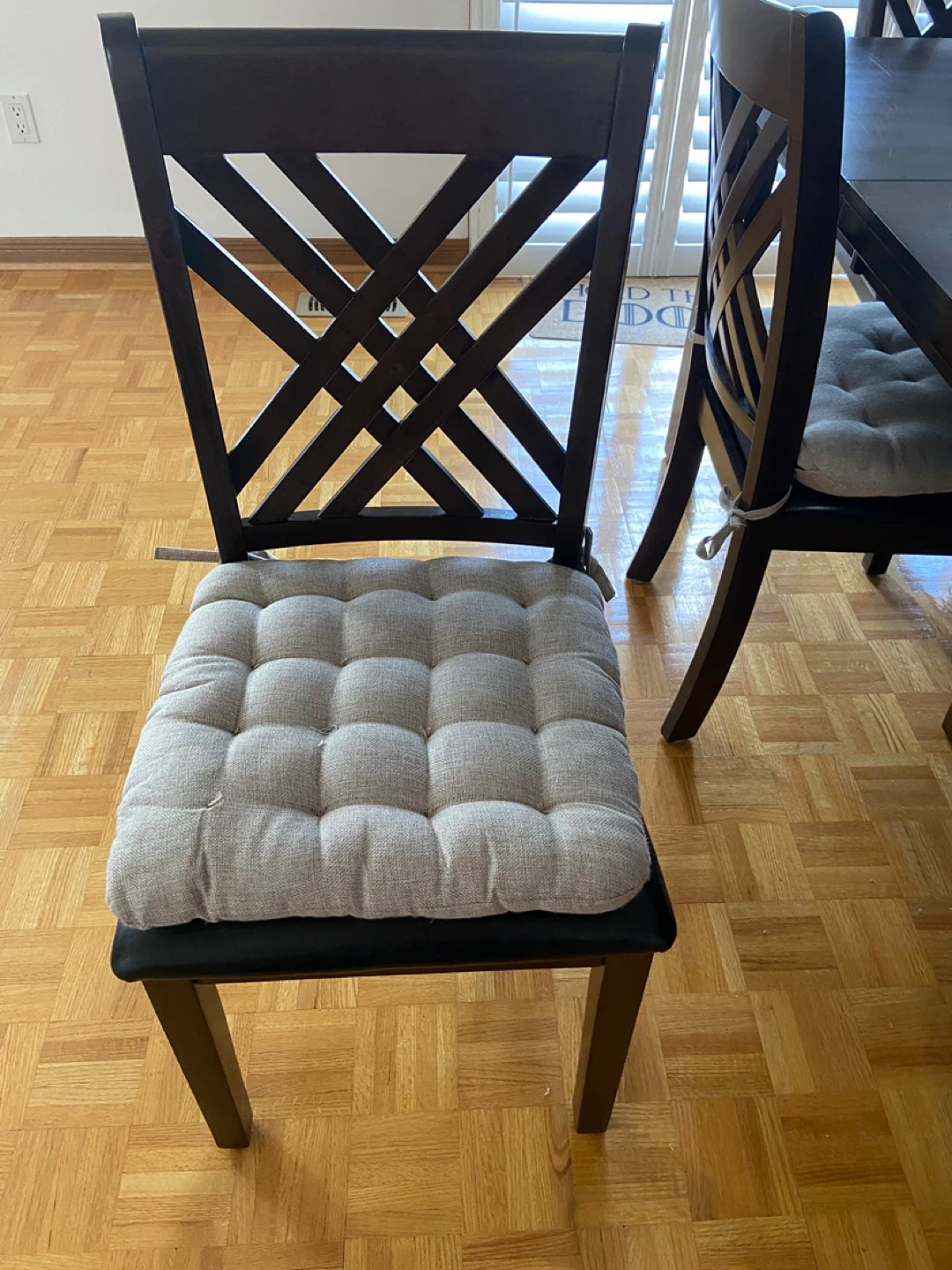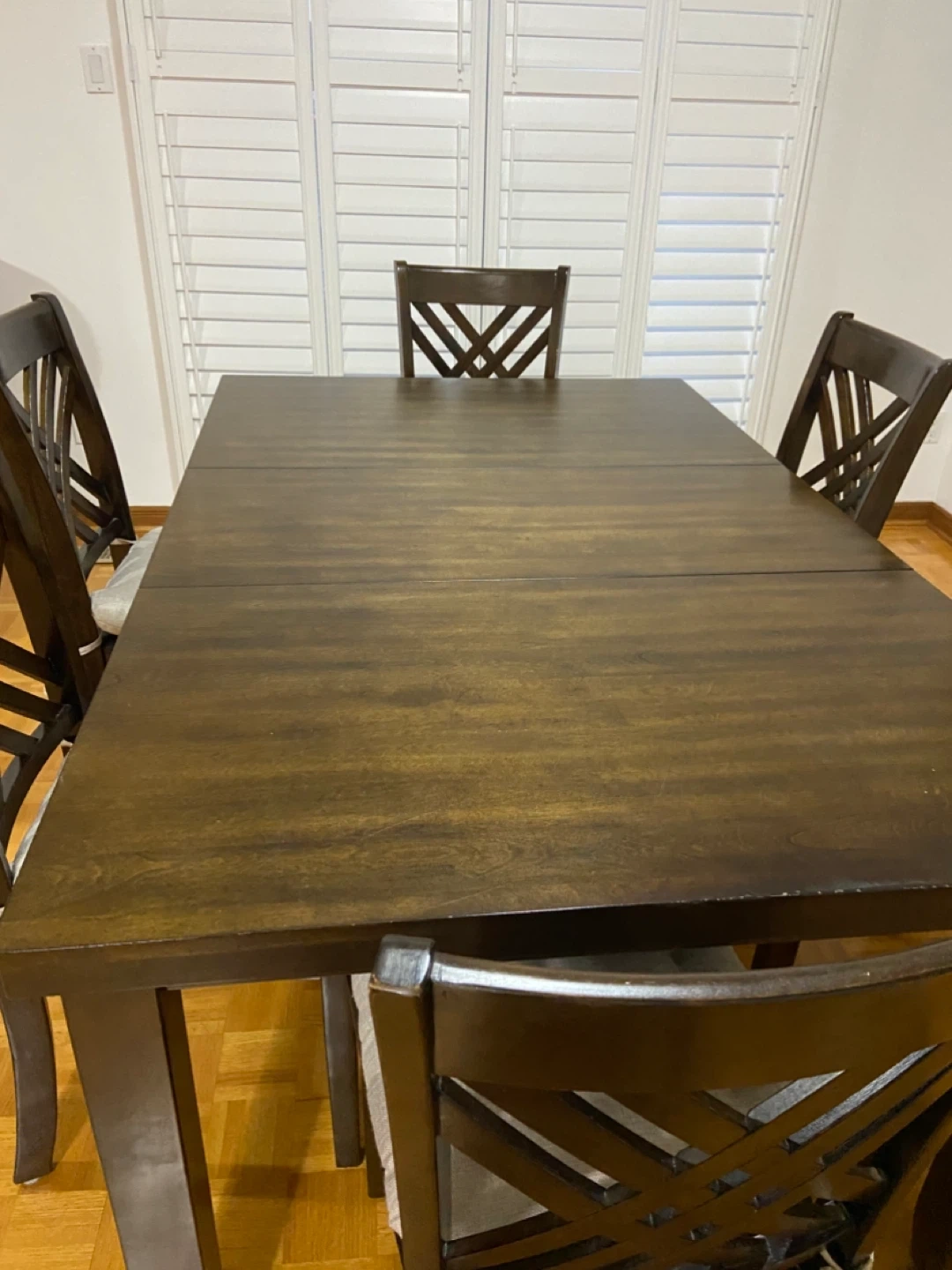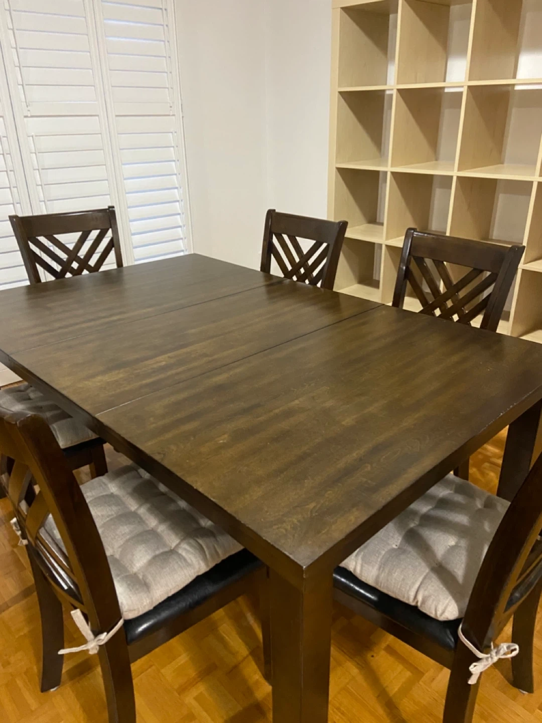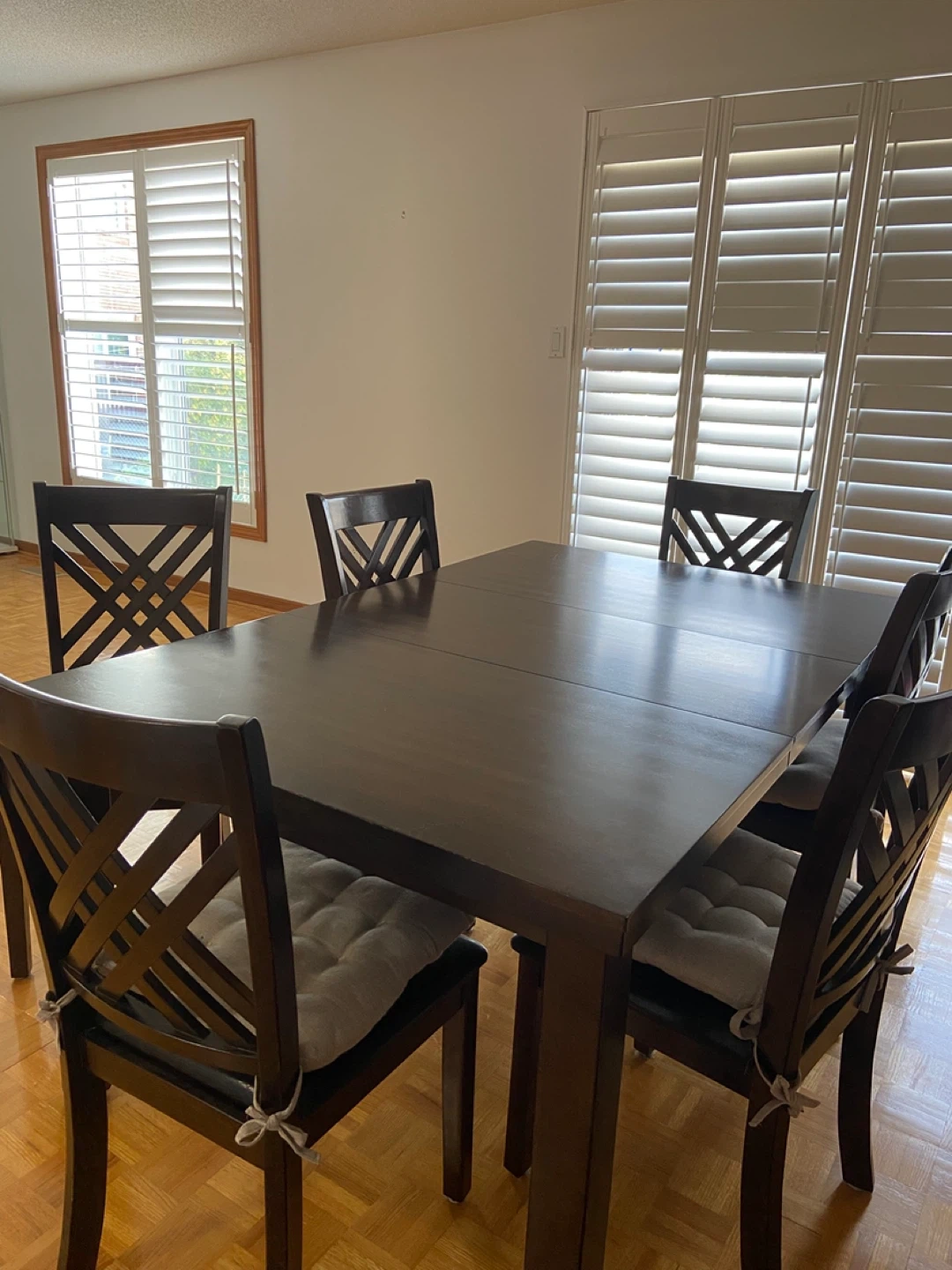Espresso coloured table with 6 faux leather chairs. Table has a removable insert and chairs have removable chair pads. The width of the table measures 42" and the length of the table with the insert measures 66" the height measures 30.5 ". Barely used and is in great condition. Asking $375 for whole set.