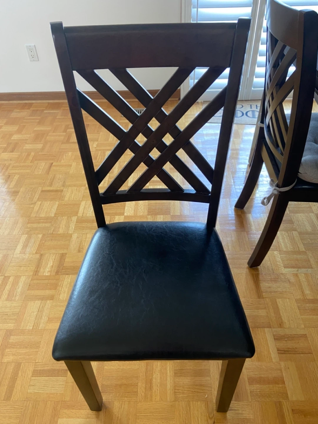 Espresso coloured table with 6 faux leather chairs. Table has a removable insert and chairs have removable chair pads. The width of the table measures 42" and the length of the table with the insert measures 66" the height measures 30.5 ". Barely used and is in great condition. Asking $375 for whole set.