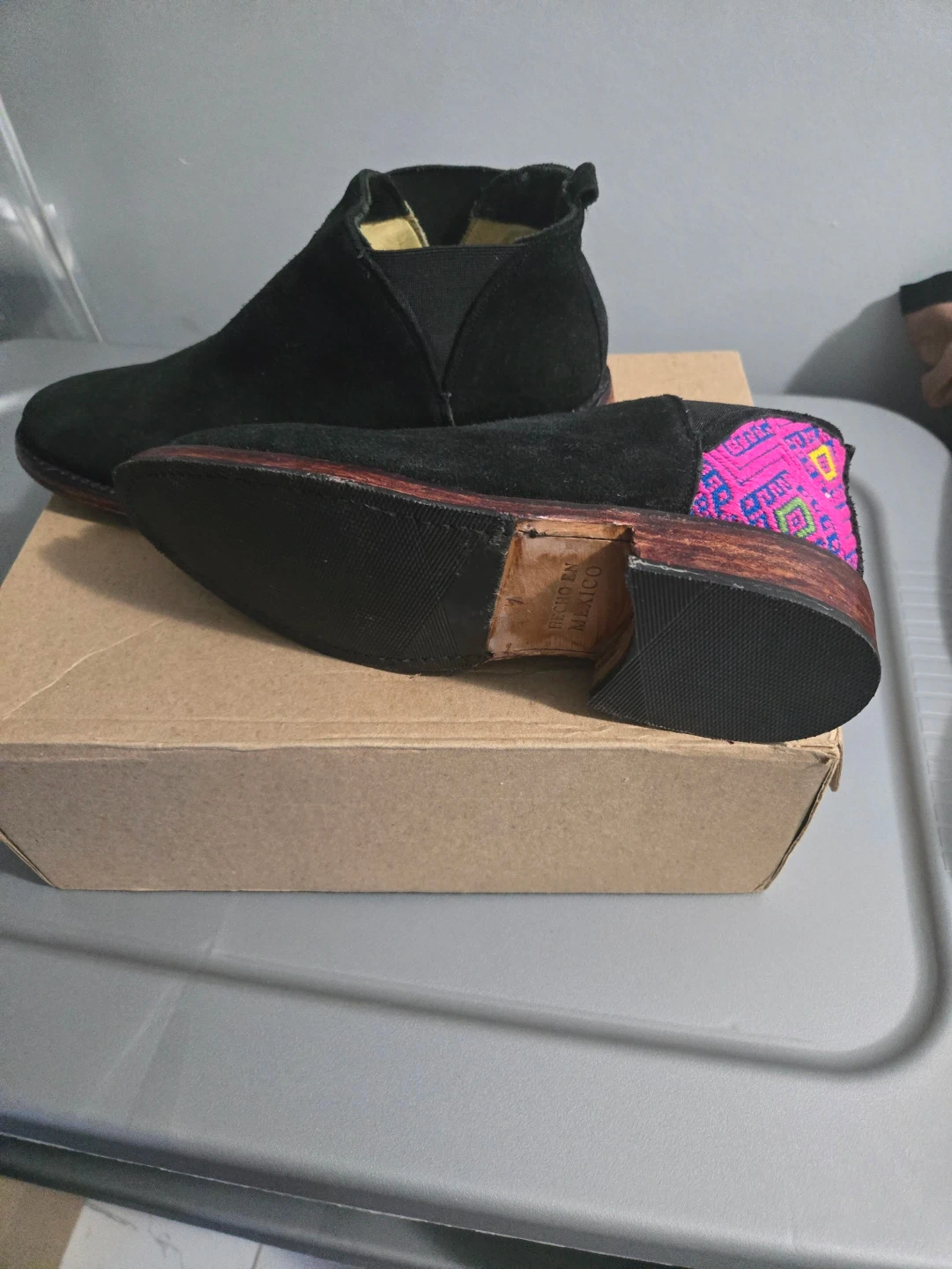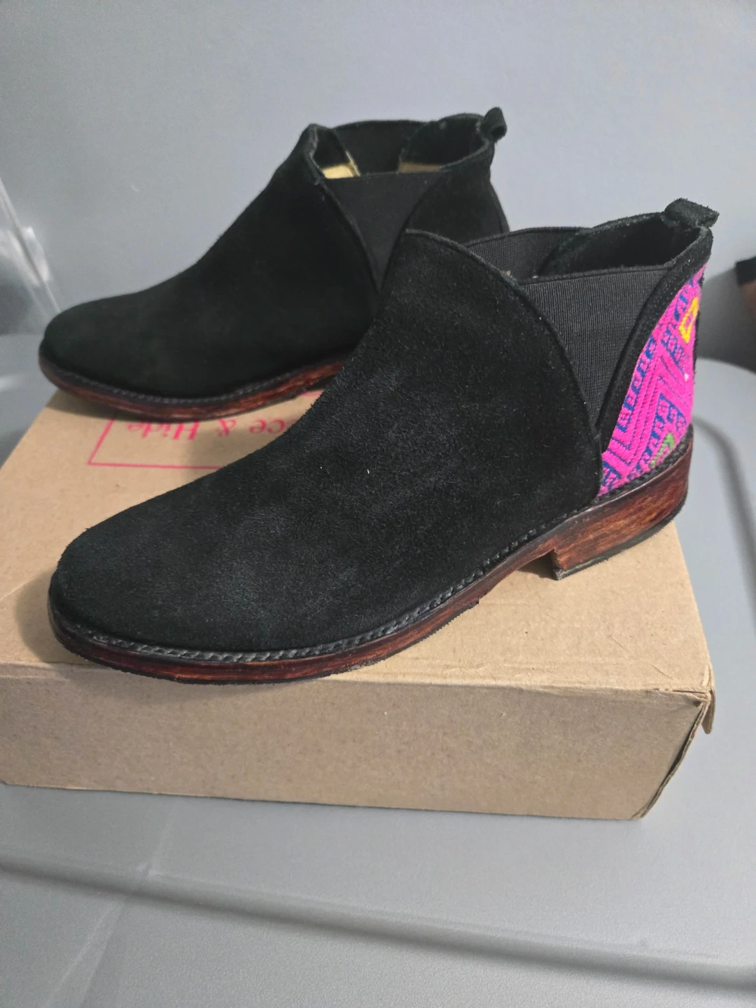 Black Suede Real Leather Ankle Boots with Embroidered Accent NEW