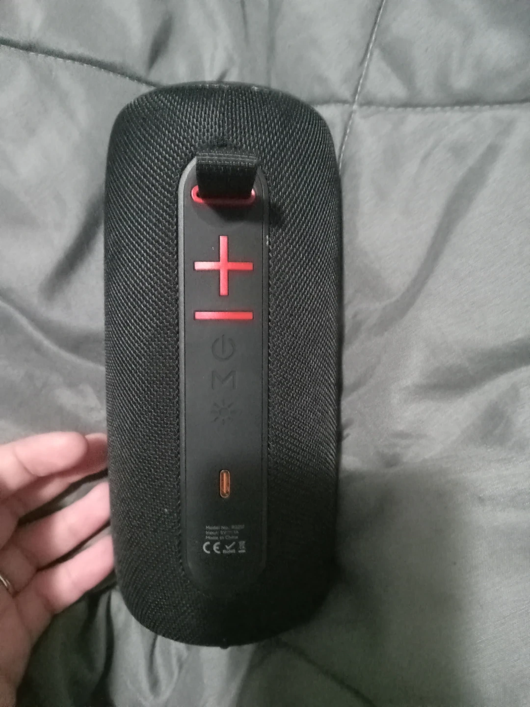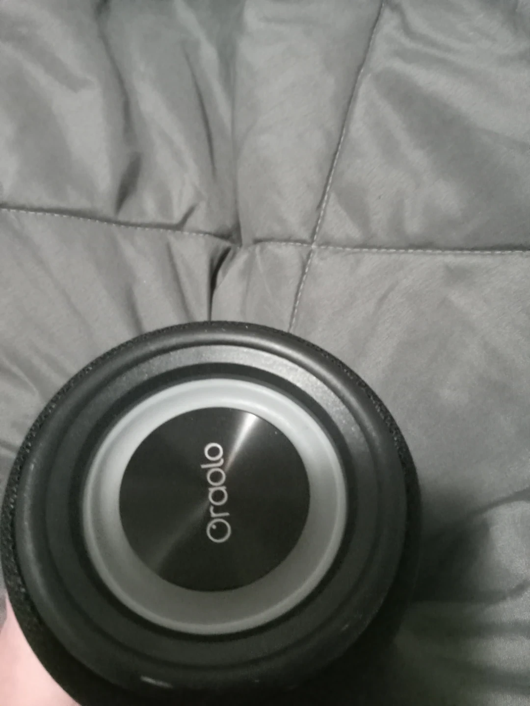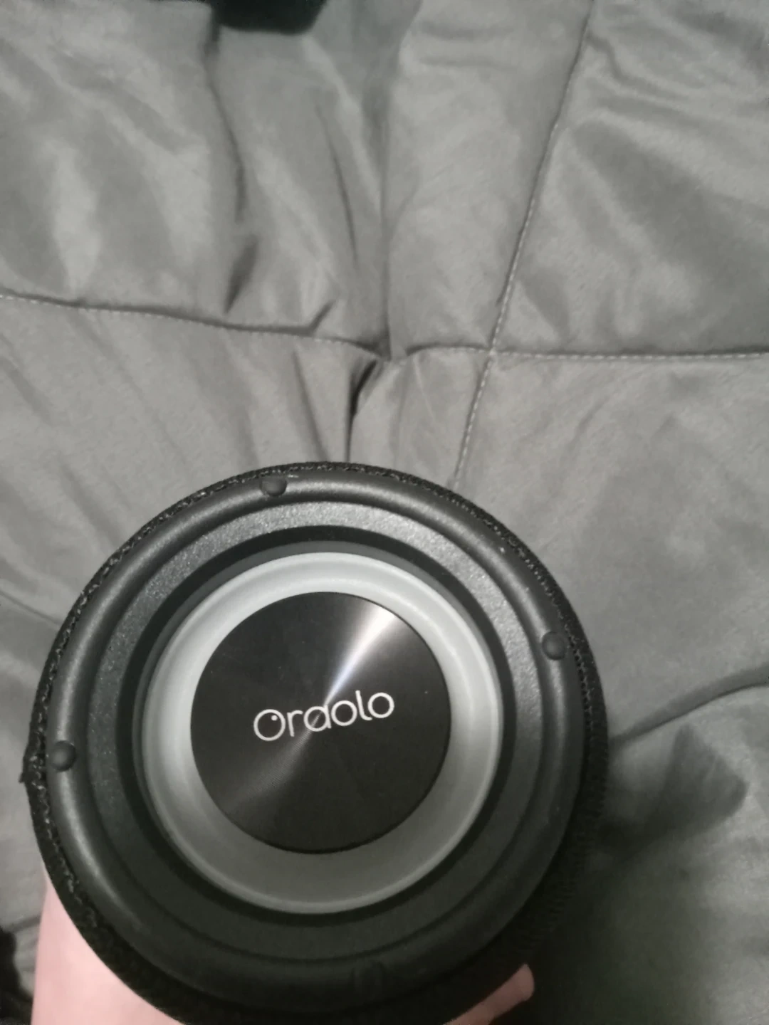 This is an Oraolo speaker. It's black with a USB-C charging port. The speaker has volume controls and a power button. Great for events or parties or just listening to music. The volume can go pretty loud if u put it up and has a good bass. It's also new and has rainbow led lights that u can change the color of